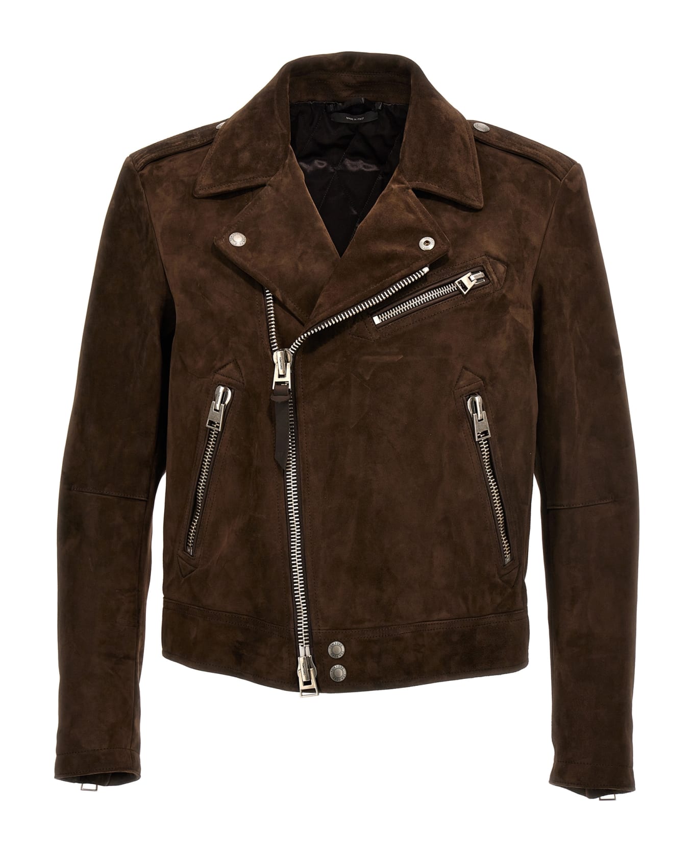 Suede nail with zip and button closure, pockets, and long sleeves.