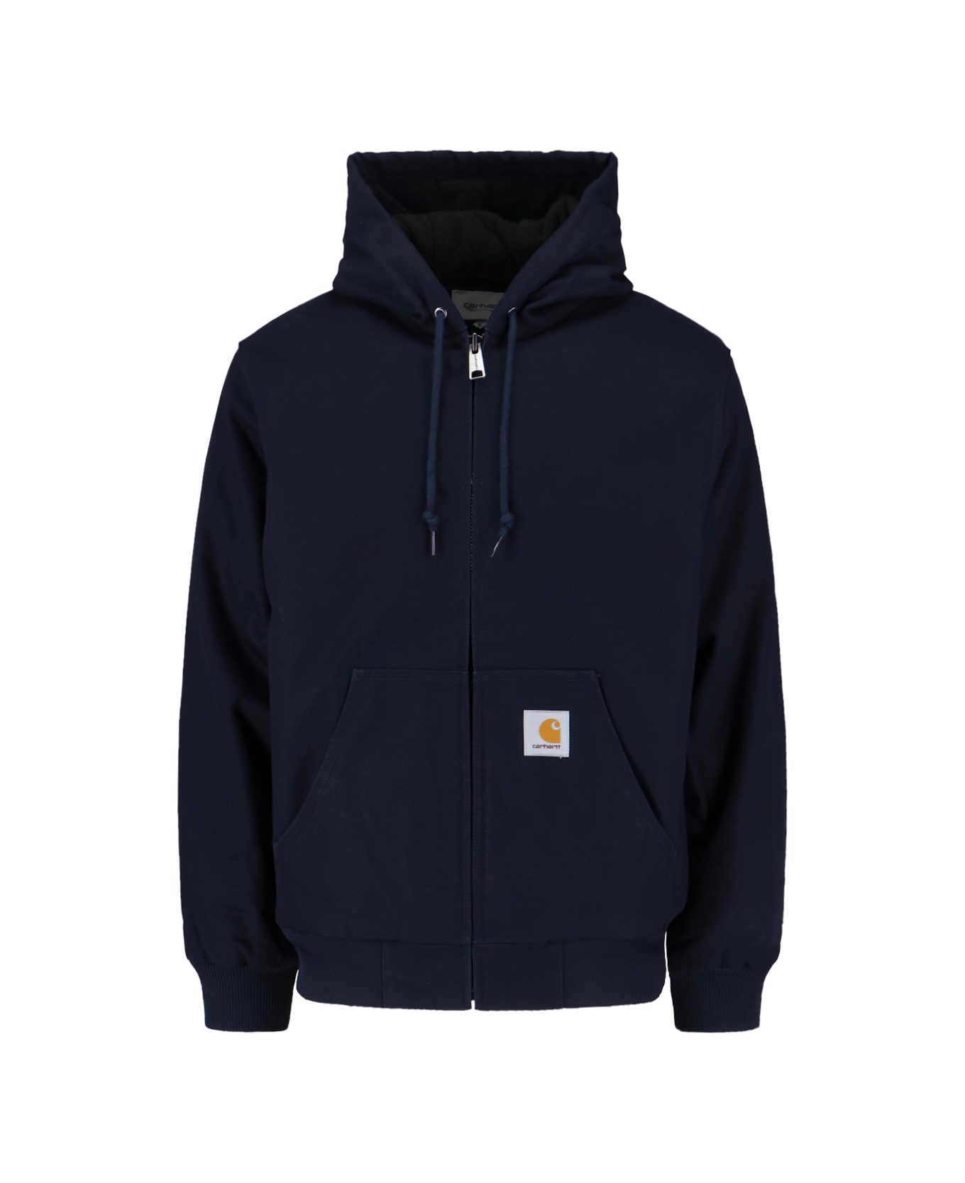 Carhartt WIP 'OG Active' blue cotton jacket with drawstring hood, zip closure, long sleeves, two front pockets, contrast logo patch detail at the front, ribbed trims, straight hem. Composition: 100% Cotton
