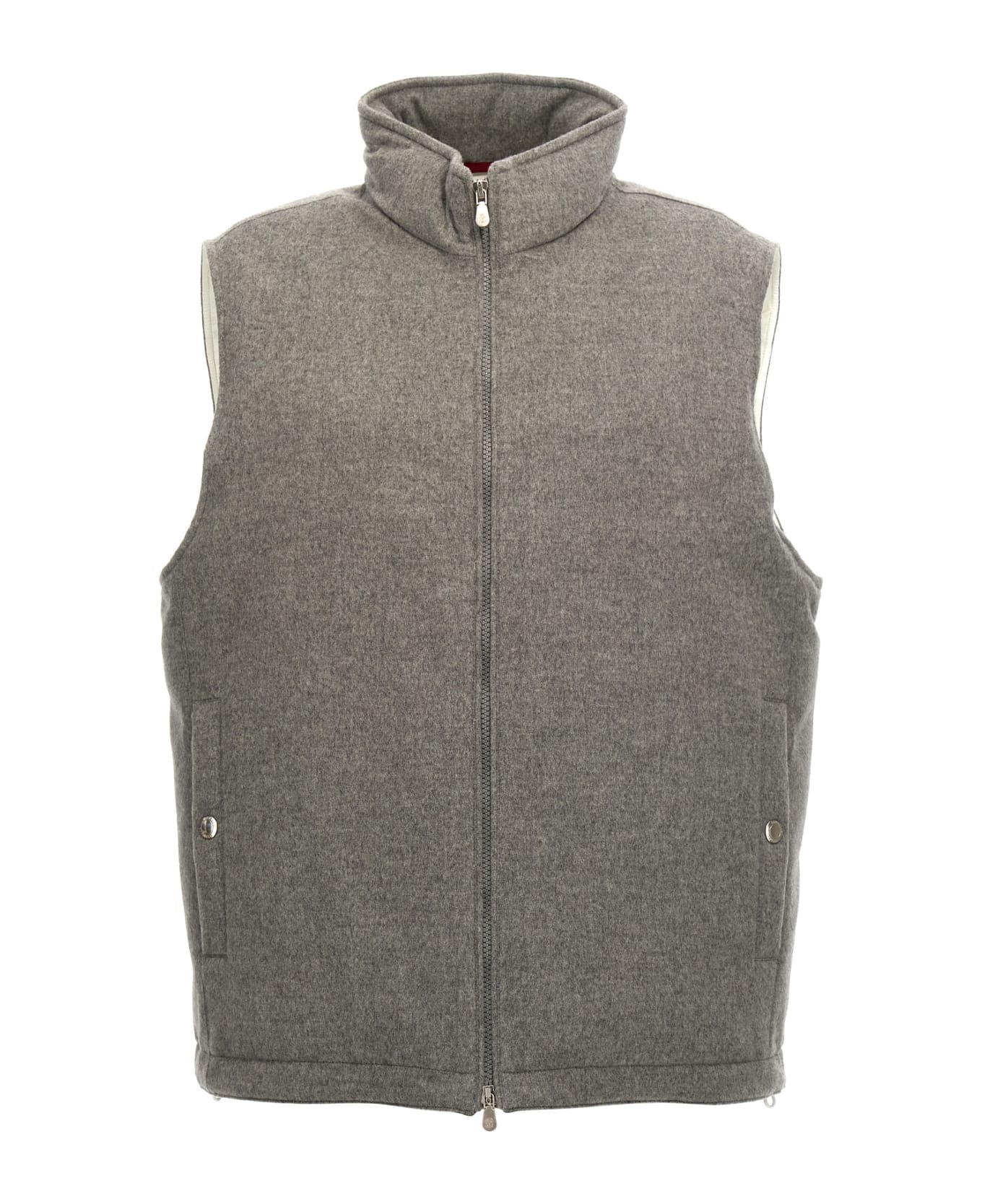 Cashmere vest, nylon lined and padded interior, zip closure, pockets.