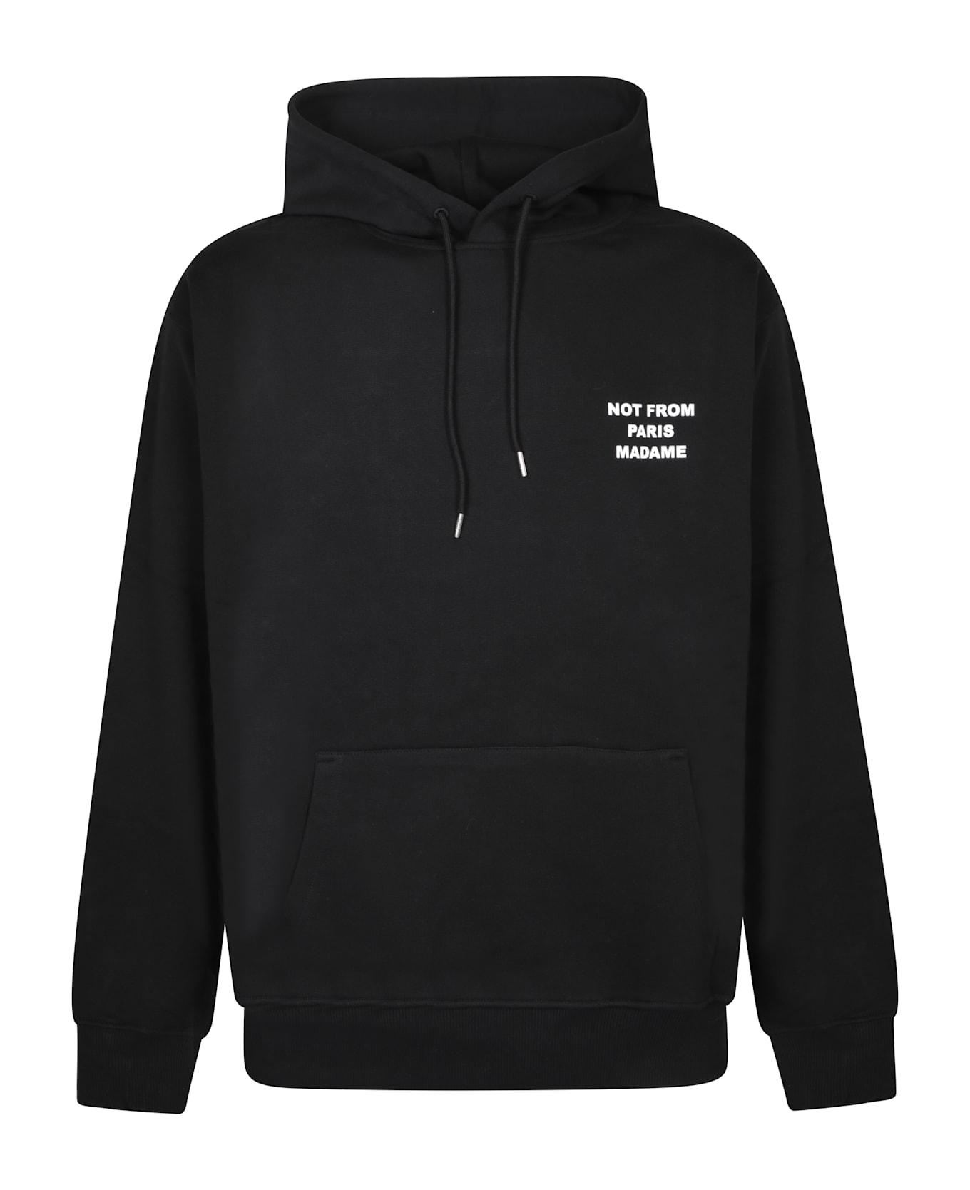 This black hoodie strikes the perfect balance between comfort and urban style. The minimalist design is enhanced by the ‘NOT FROM PARIS MADAME’ print, adding a touch of character and irony.
