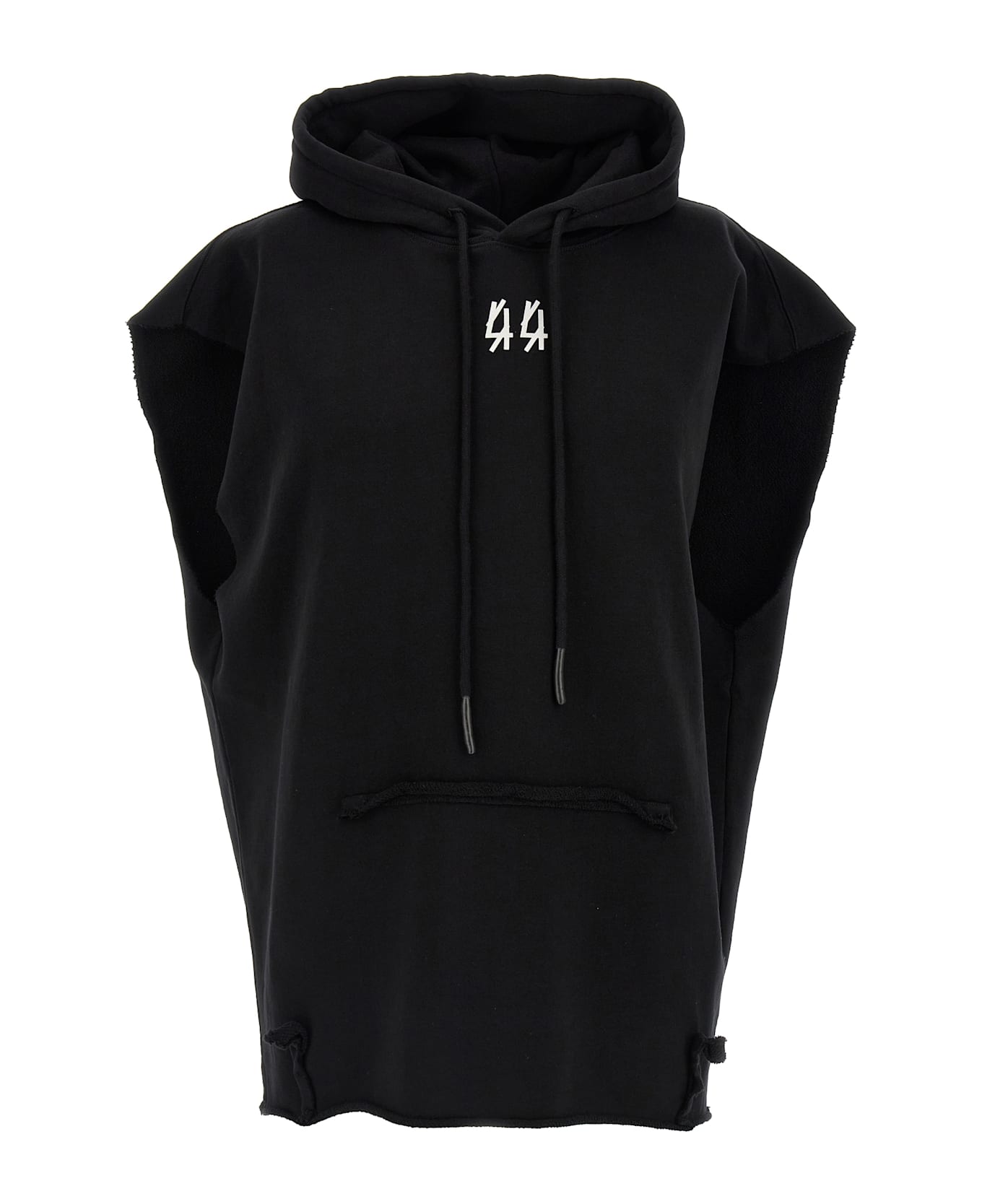 'Centipede' gauze cotton hoodie with front and back print, kangaroo trompe l'oeil pocket, sleeveless, raw cut hem.
