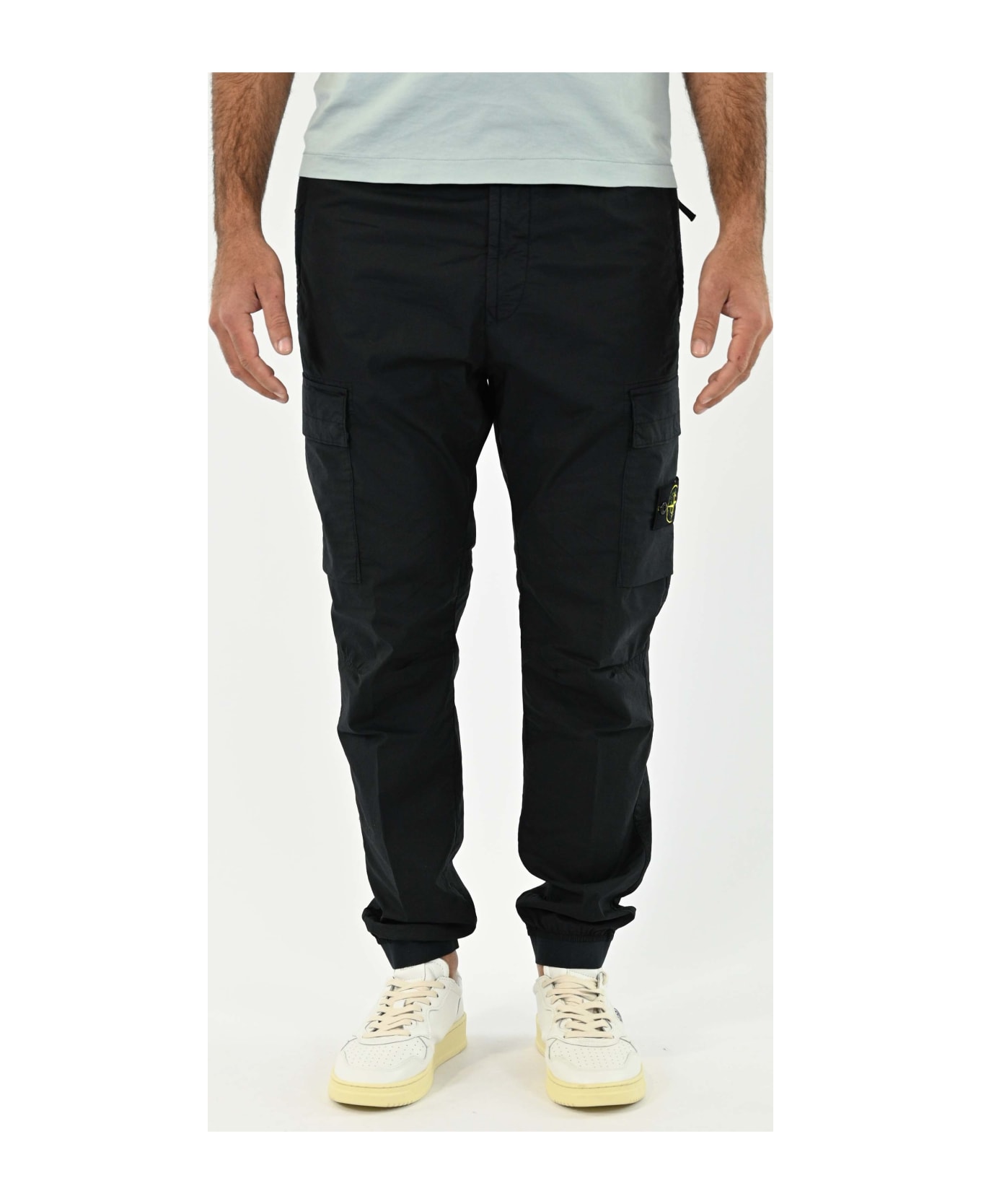 regular tapered fit. welt pockets with hidden zip. one pocket with hidden snap on the back. bellows pocket on the legs, closed by flap and hidden snaps; stone island badge on left pocket. engineered knees. elastic leg bottom. elasticated waist with internal drawstring. zip closure. details