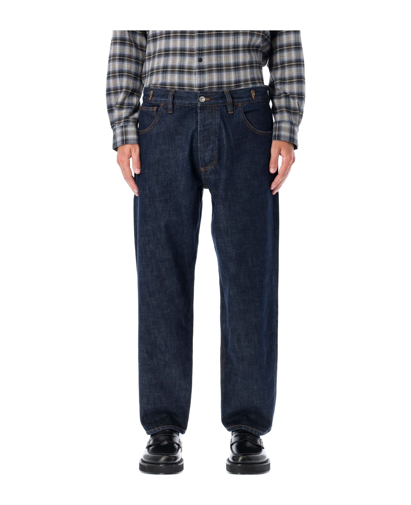 Bez Jeans By Ymc. Featuring: Raw Indigo Denim Fabric Loose Fit Classic Five-pocket Design Button Fly With Top Button Closure Contrast Stitching Detail Straight-leg Silhouette Branded Leather Patch On The Back Model Is 1,90m And Wears Size 32.