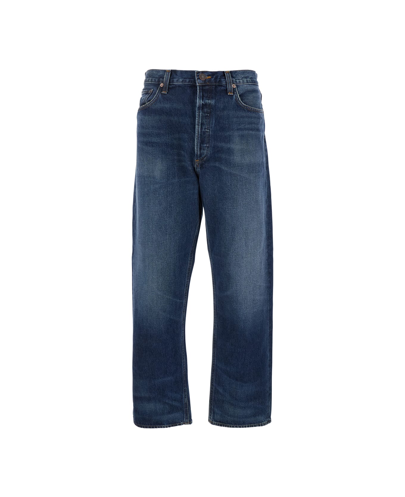 Jeans Blue Five-pocket design Belt loops Button and hidden zip fastening Logo application on the back Straight leg Regenerative cotton Relaxed fit