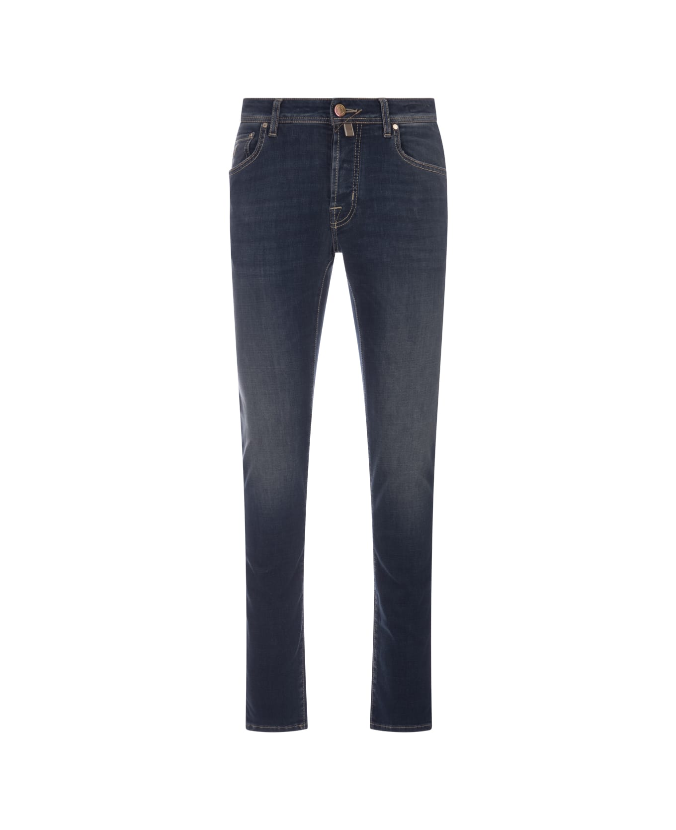 Nick Slim jeans by Jacob Cohen made of blue stretch cotton blend denim featuring a medium waist, belt loops, contrast stitching, a five pocket design, a buttoned flap, and an embroidered logo on the breast pocket. Inner flap embroidered with trouser name. Multicoloured striped pony skin with contrasting embossed logo. Includes printed bandana. Scented with exclusive Jacob Cohen fragrance. Contains non-textile parts of animal origin.