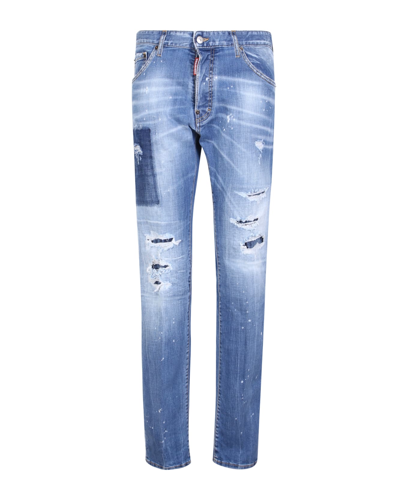 Mid rise. Front button and zip fastening. Belt loops. Classic five pocket. Logo tag to the front. Graphic print patch to the rear. Distressed effect. Paint splatter detail. Regular fit. Color: light blue