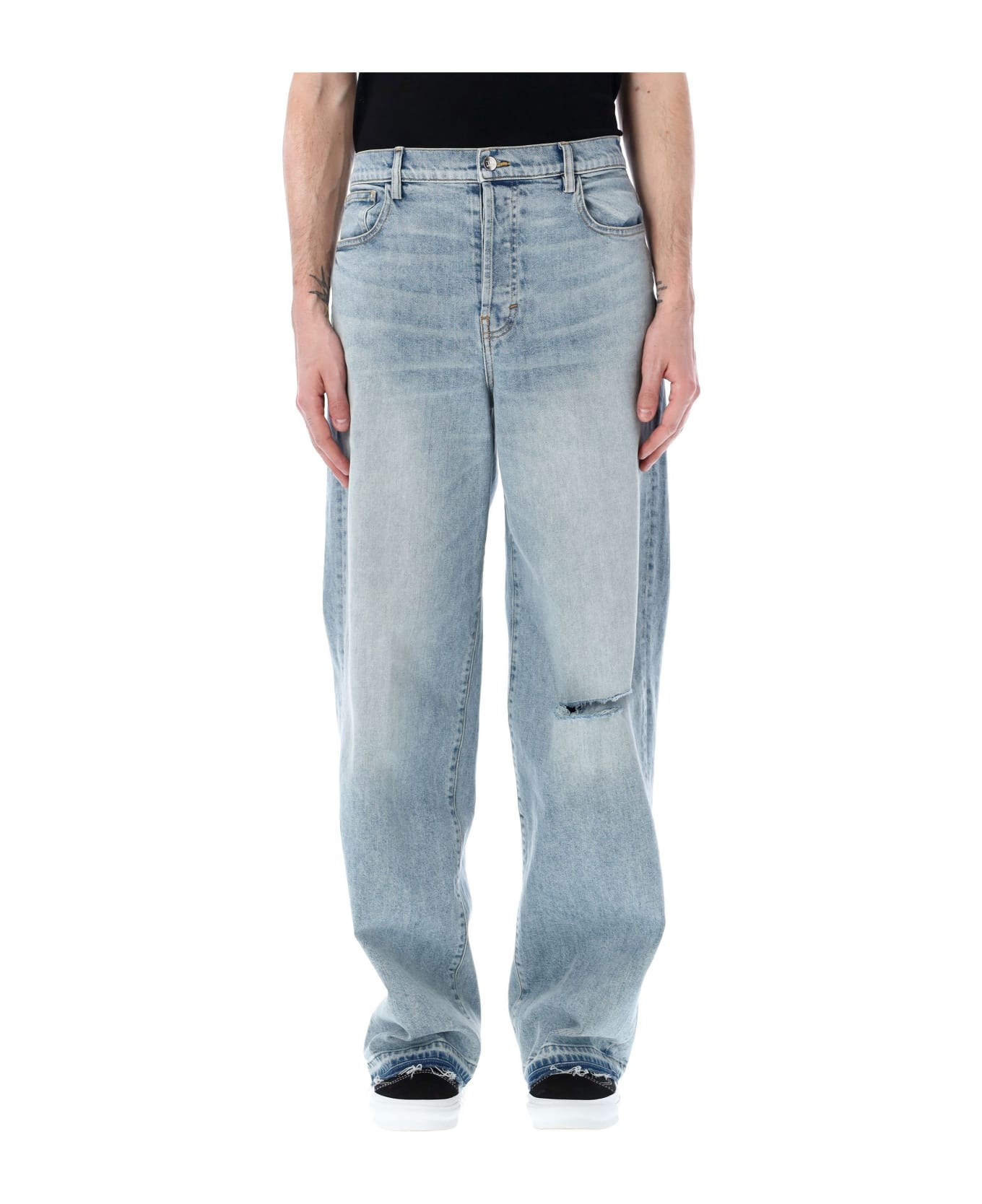 Denim Baggy Jeans Light Wash By Nahmias. Featuring: Regular Waist Button Fastening Belt Loops Five Pockets Wide Legs Ripped Detail Frayed Hem Logo Patch At Back Model Is 1,90 M Tall And He Is Wearing Size 34