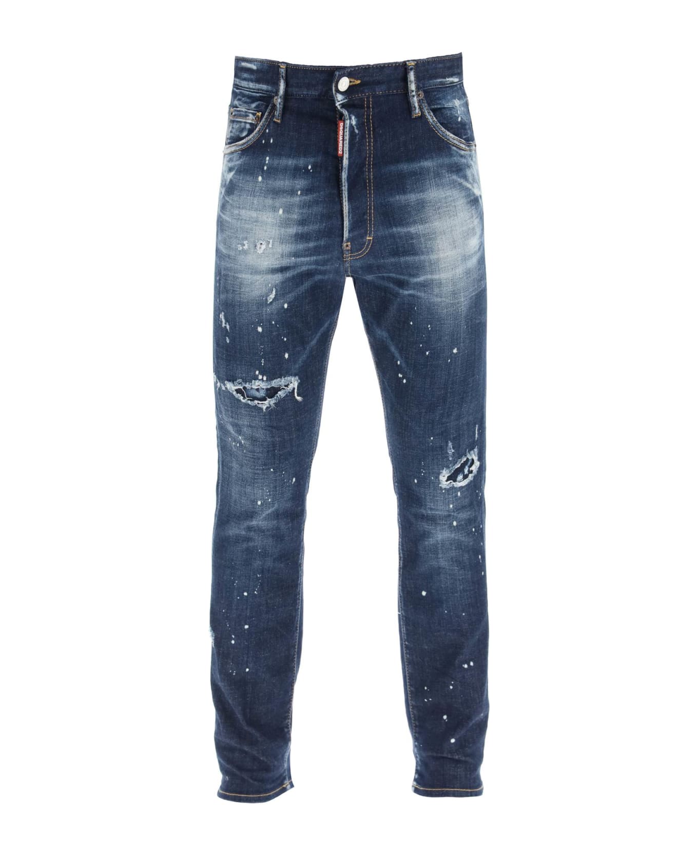 Relax Long Crotch five-pocket jeans by DSquared2 crafted in Goth Surfer wash stretch cotton denim, featuring all-over distressed details and logo lettering print on the back. Low-rise slim fit design with dropped crotch, belt loops and concealed front buttoning. Leather logo jacron on the back the waistband. The model is 187 cm tall and wears a size IT 46.
