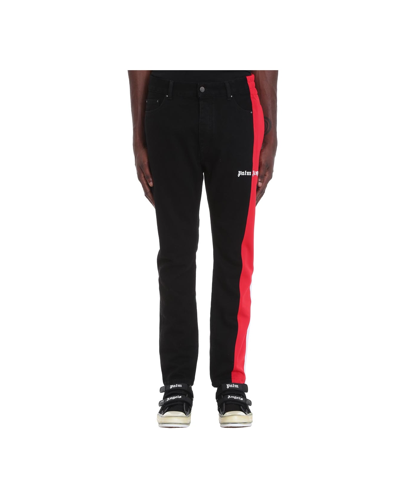 Jeans in black denim, frontal buttons closure, belt loops, five pockets, slim fit, jersey band on side with logo print, Model is 187 cm and wears size 46 Composition: Denim