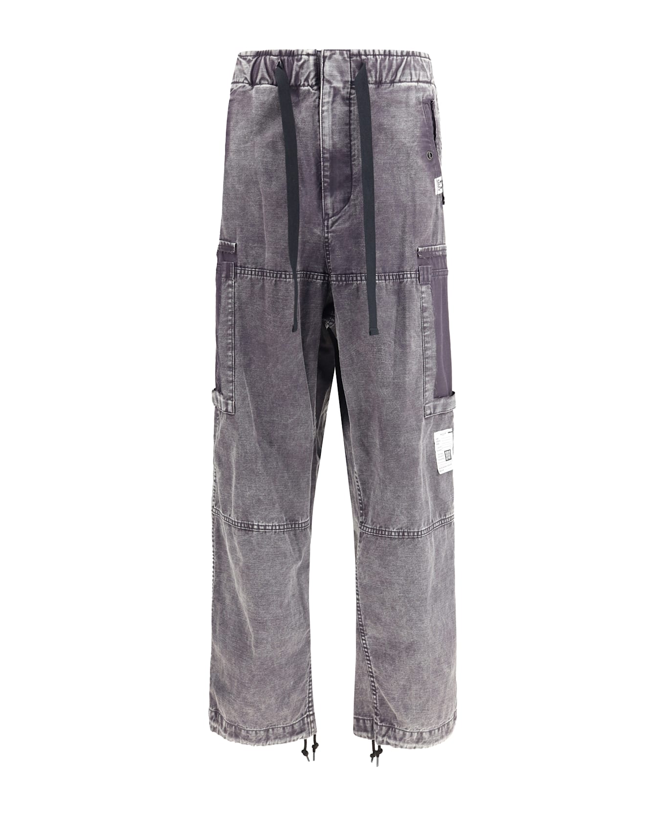 The cargo pocket drawstring trousers by maison mihara yasuhiro are crafted from light and elegant cotton satin fabric with a vintage finish for an authentic, worn-in look. featuring side and back pockets, an elasticated waistband with belt loops, and attached waist ties, the trousers are completed with a drawstring hem for an adjustable fit that blends functionality with the brand s experimental aesthetic.