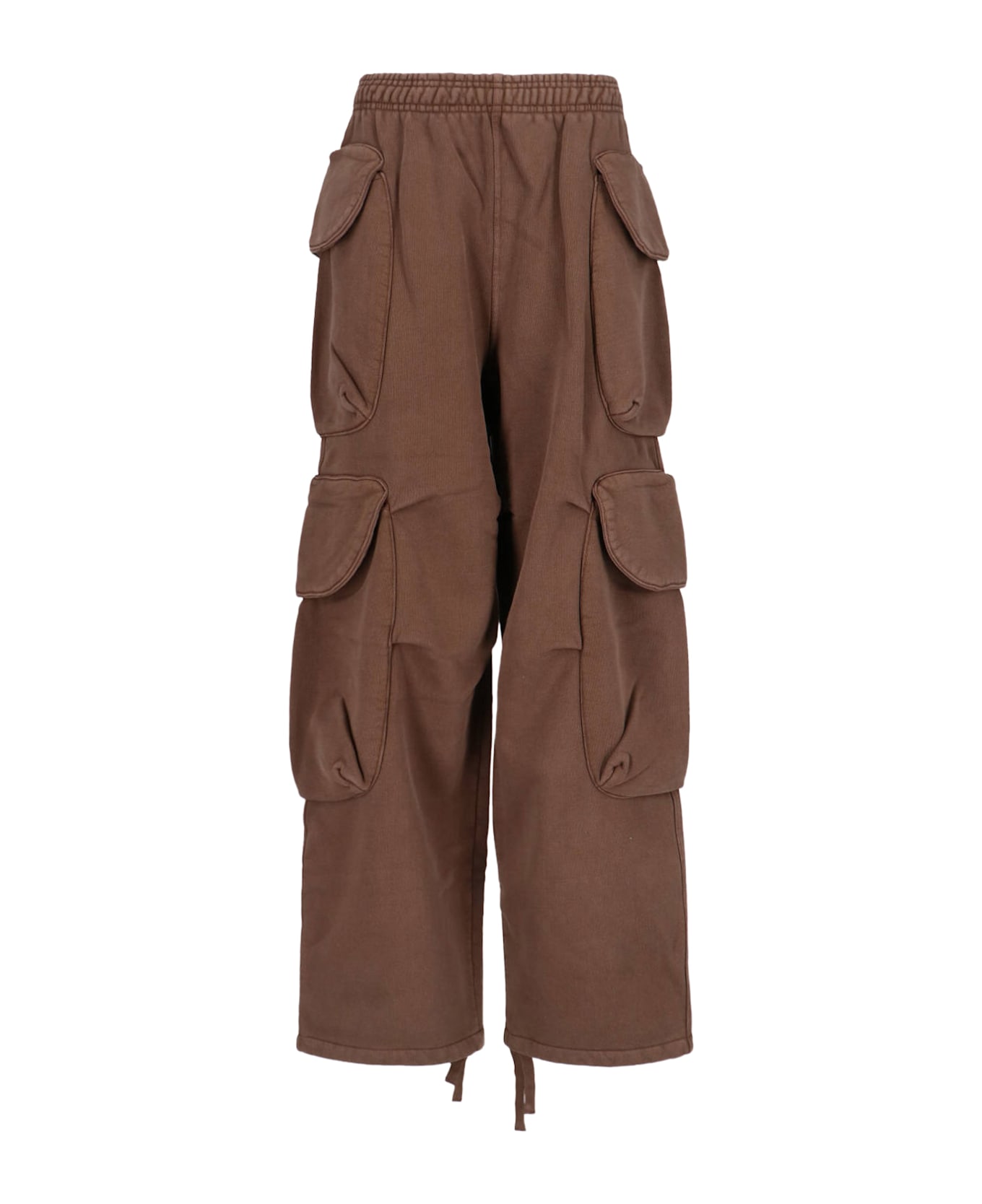 Entire Studios 'Gocar' brown cotton track pants with distressed wash, high elastic waistband, drawstring closure, four side cargo pockets, drawstring at hem, straight leg.