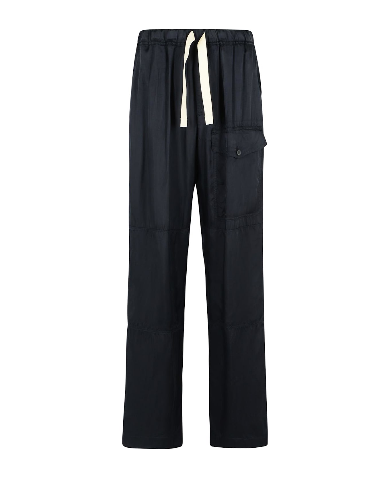 Drawstring elastic waistband, zipper concealed by flap, two side pockets, tone-on-tone stitching, front button pocket, two back pockets