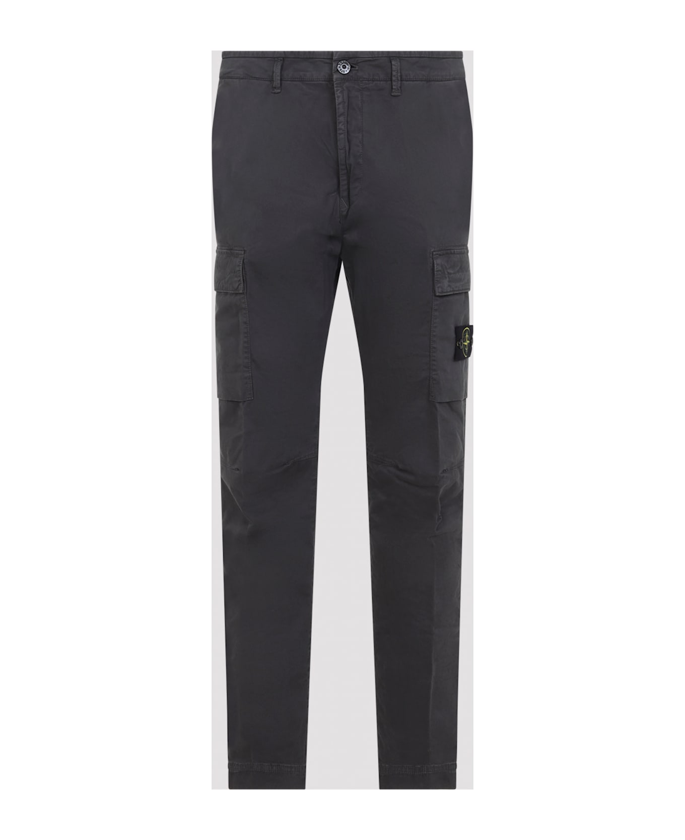 Stone Island Charcoal Cotton Trousers. Crafted in cotton and elastane blend. Front concealing zipped fastening, front buttoned fastening, belt loops, back slit pocket, side cargo flap pockets along the legs, patch logo on the right leg, straight hem.