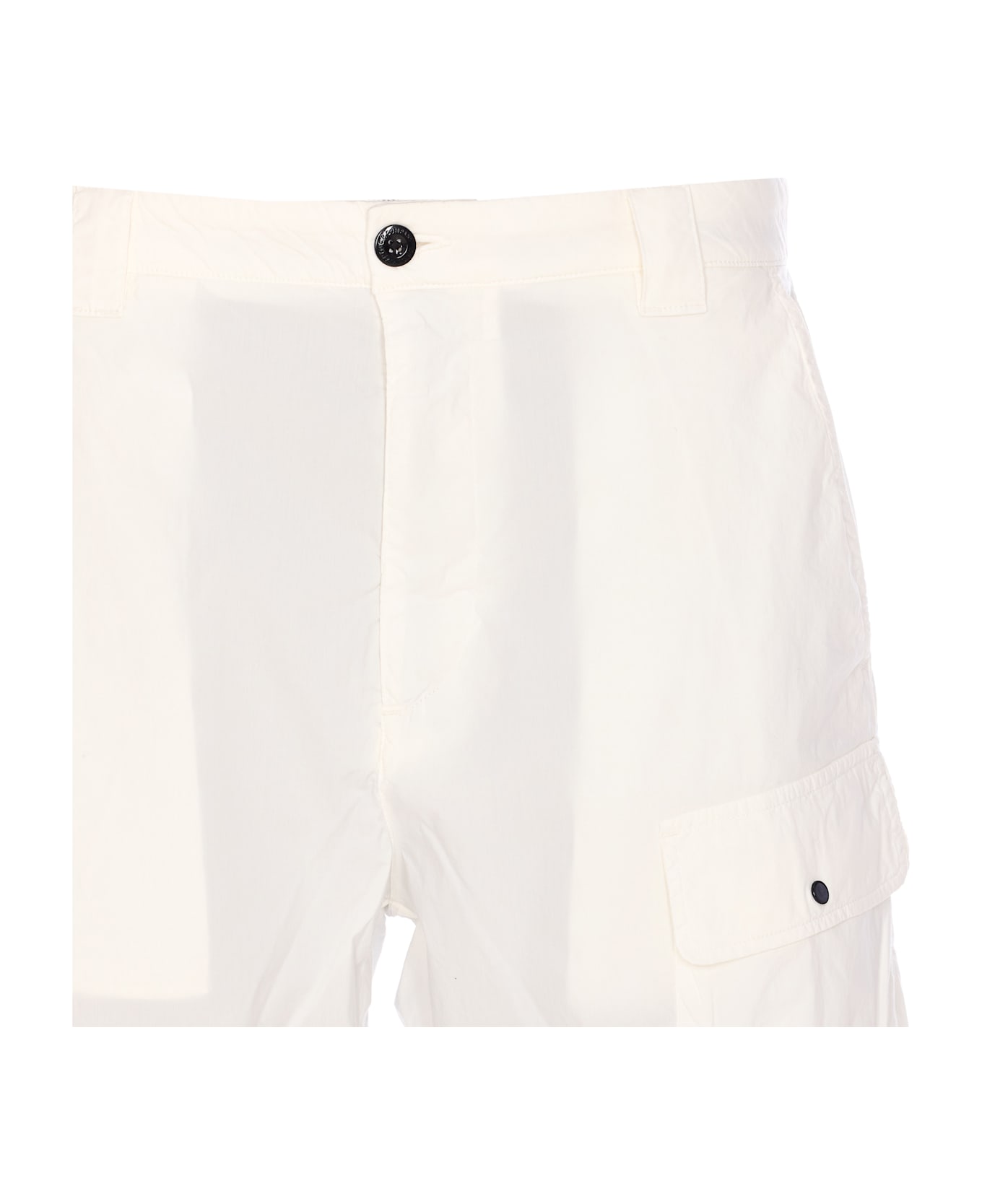 C. P. Company white cargo shorts, button and zip closure, lateral pockets, cargo model, zip pocket on side, patch logo detail Composition: 65% Cotton, 28% Polyamide, 7% Elastane