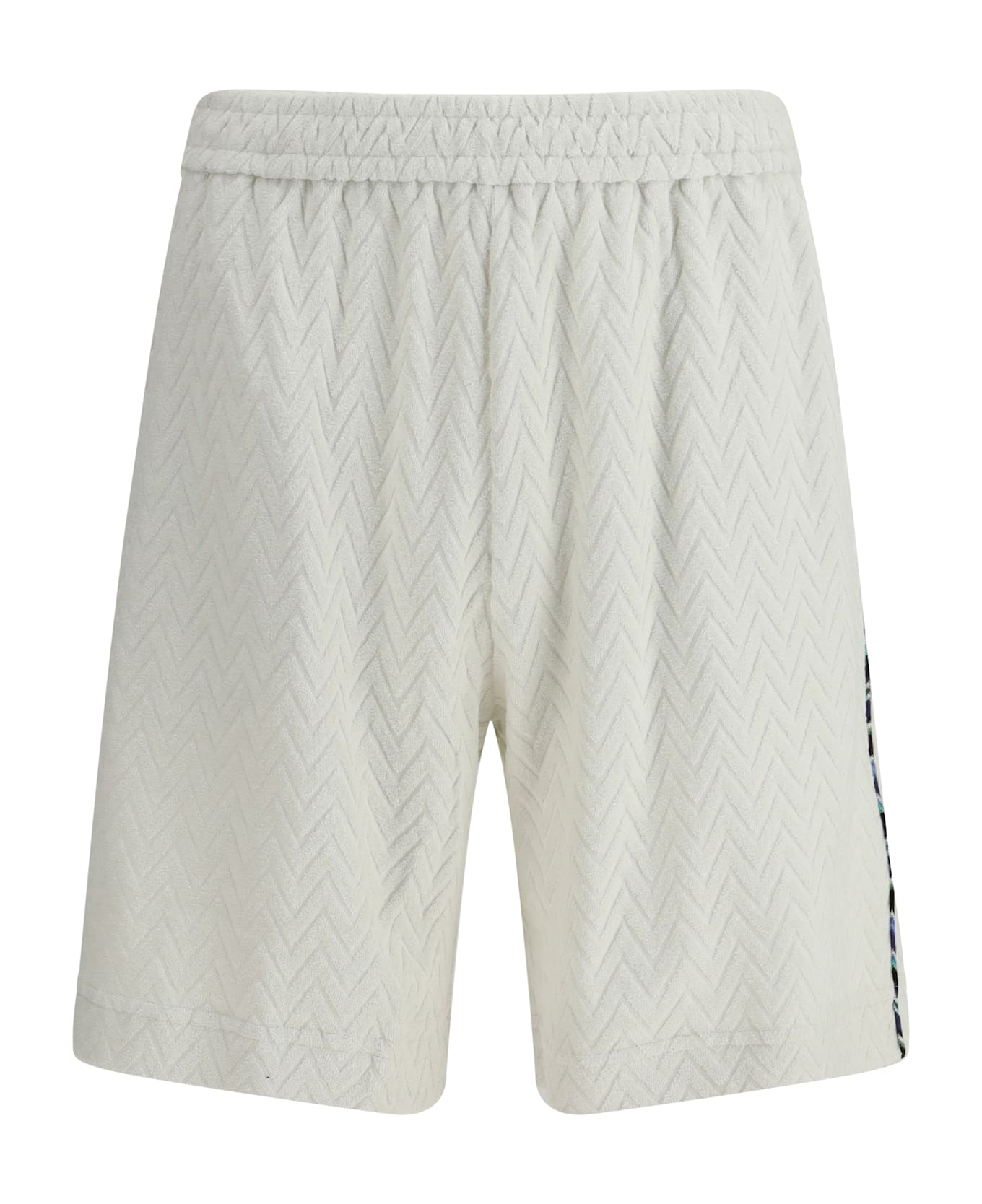 Missoni's cotton terry shorts stand out for the vibrant zigzag chevron pattern that decorates the entire garment, an expression of the brand's dna. contrasting piping adds a graphic and dynamic touch, while the elasticated waistband and two side welt pockets ensure comfort and functionality. ideal for a refined yet relaxed summer look.