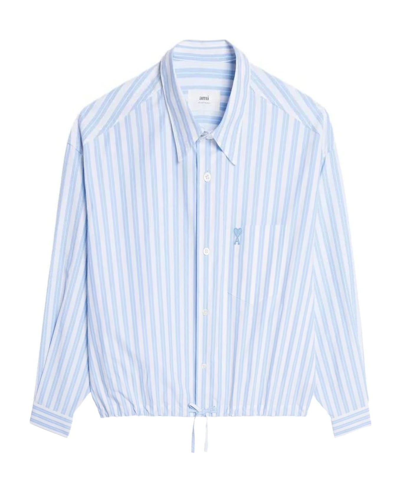 Blue and white cotton shirt, signature Ami de Coeur monogram motif, vertical stripe print, classic collar, front button fastening, long sleeves, buttoned cuffs, chest patch pocket, drawstring hem Composition: Cotton, 100%
