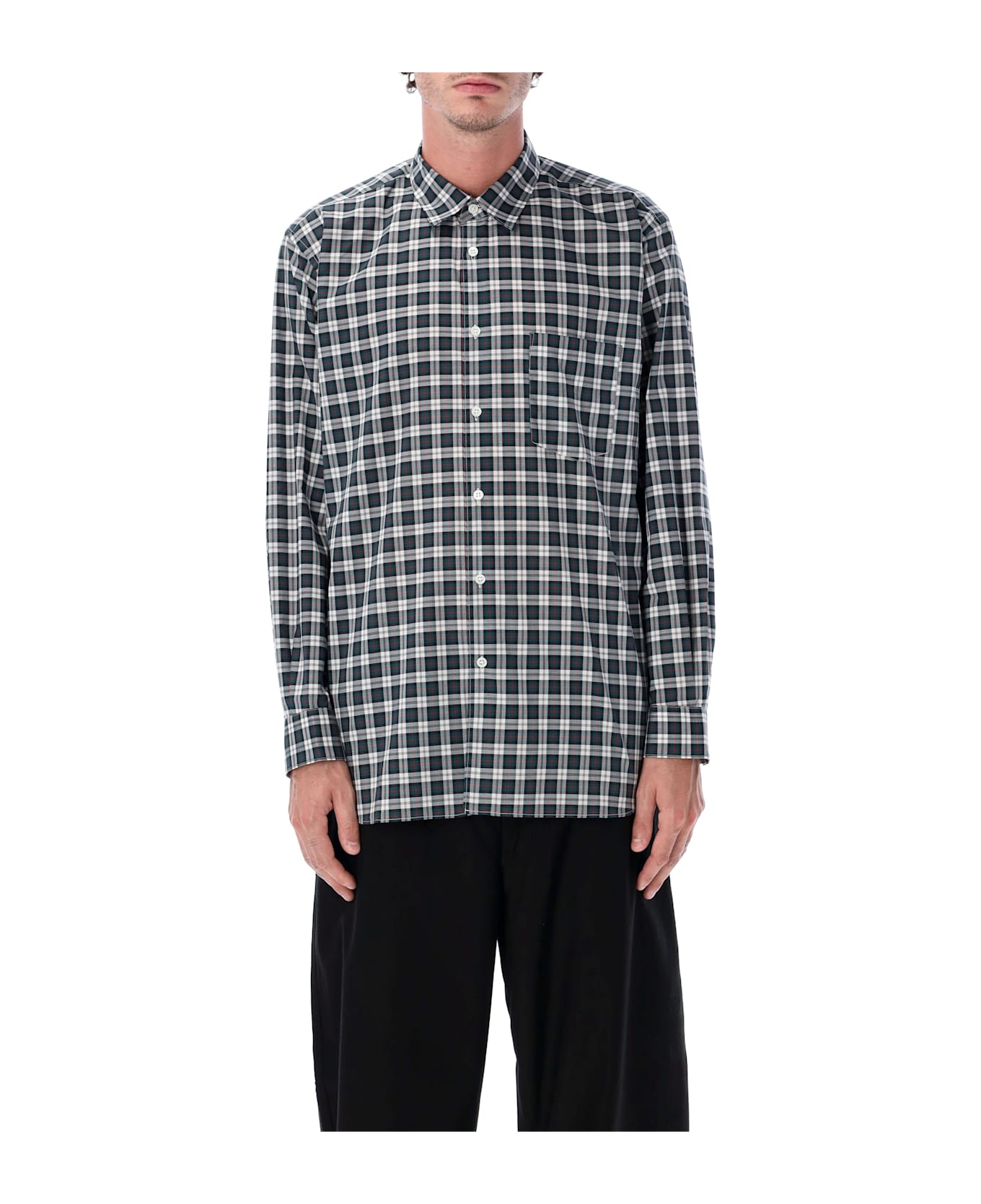 This Comme Des Garçons Shirt Design Is Cut From Pure Cotton And Defined By Its All-over Checked Motif. Tailored With A Pointed Collar, Button-down Front, And Single Chest Pocket, It Combines A Relaxed Silhouette With Precise Detailing. Lightweight Yet Structured, It Is A Versatile Wardrobe Essential That Transitions Seamlessly From Casual Layering To Refined Everyday Outfits. Checked Pattern Pointed Collar Button-down Closure Single Chest Pocket Long Sleeves With Buttoned Cuffs Relaxed Fit Andrea Is 1,90 M And Wears Size L