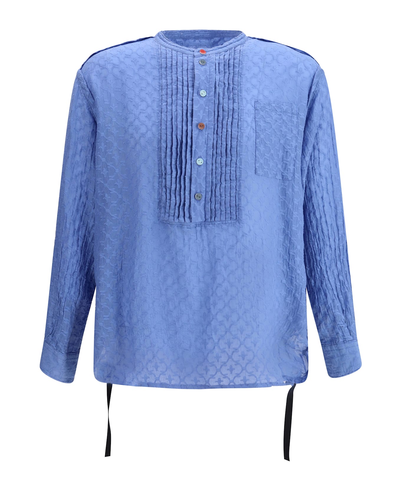 Undercover's cotton and silk blouse combines elegance and originality with its sophisticated design and unique details. it features a crew neck and a half-bust closure with multicolored buttons, which add a lively touch to the garment. an applique welt pocket on the front and adjustable button cuffs complete the look. ribbons inserted in the side panels allow the fabric to curl, creating a dynamic and creative effect. an eye-catching garment with its mix of elegance and experimentation.