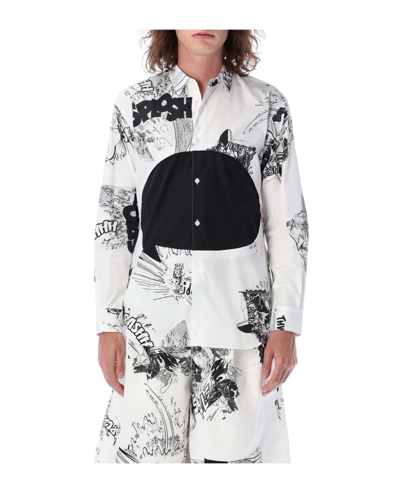 White Cotton L/s Shirt Marclay By Comme Des Garçons Shirt. Featuring: - Comic-style Motif - Designed By The Artist Christian Marclay - Pointy Collar - Front Button Fastening - Contrasting Black Panel At Front - Long Sleeves With Buttoned Cuffs - Curved Hem