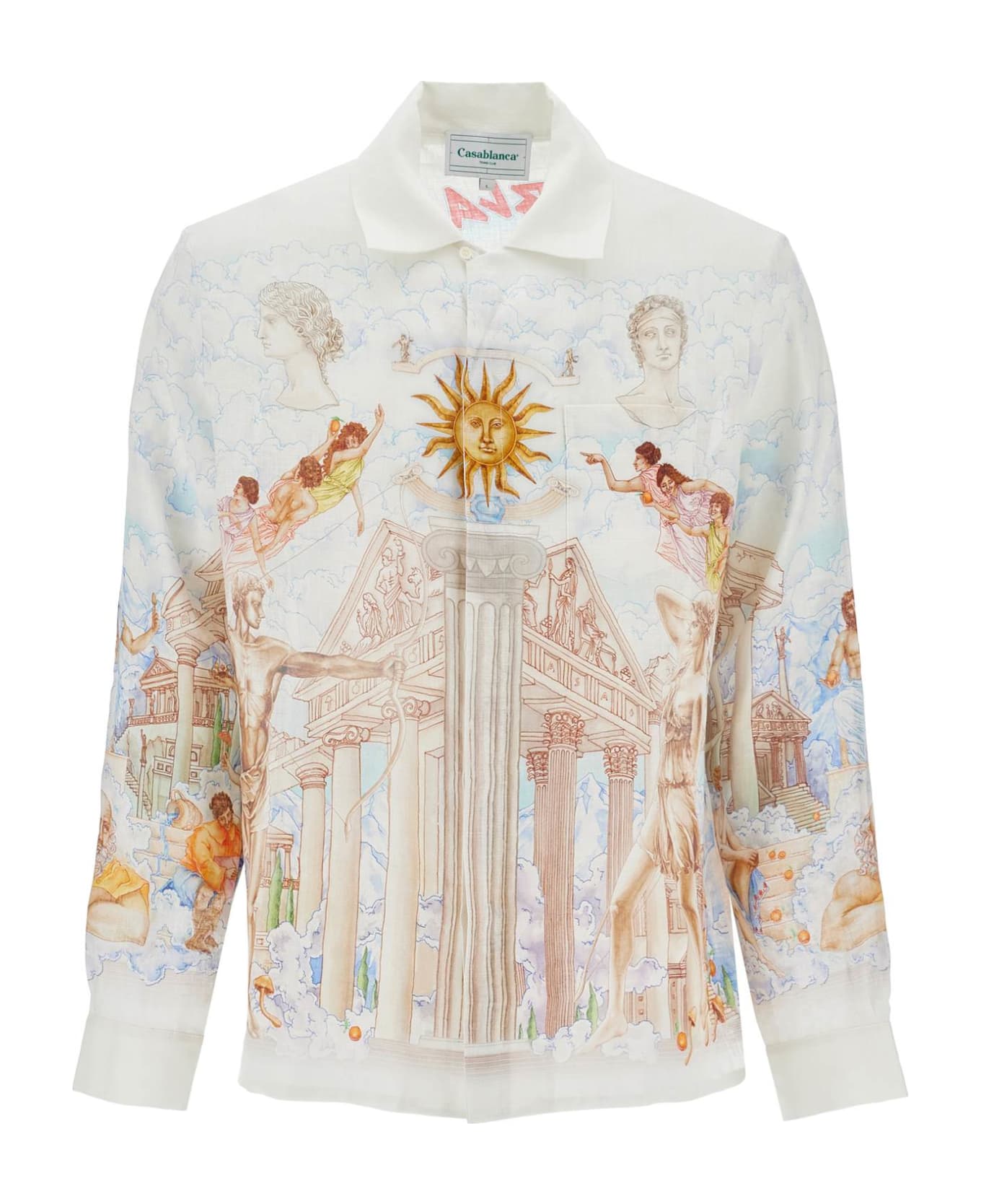 The Casablanca shirt is made of linen with an all-over Le Temple Du Savoir print. It features a front button closure, Cuban collar, and a relaxed fit. The model is 187 cm tall and wears size L. Composition: 100% LI