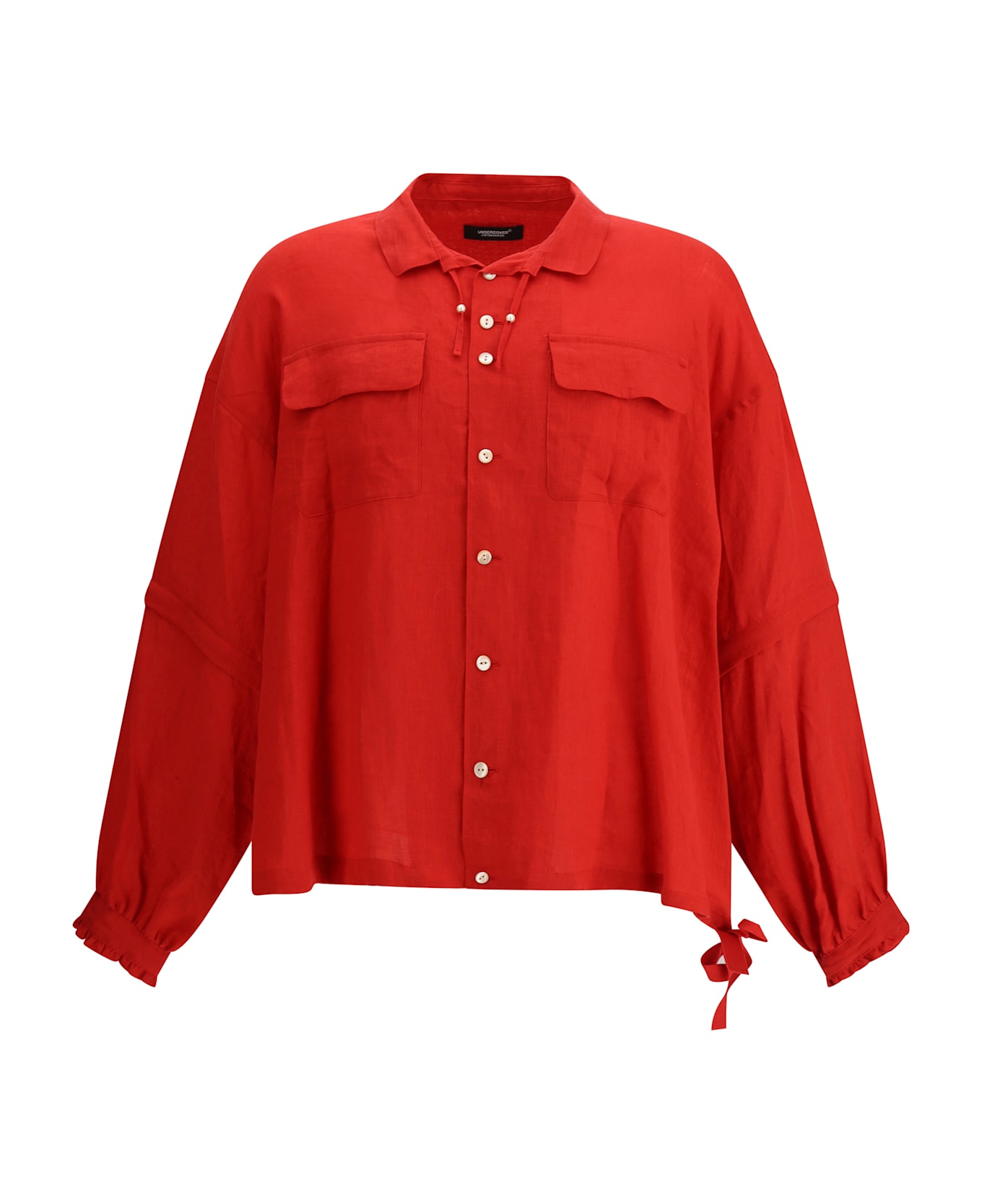 Undercover's linen oversize shirt by undercover combines contemporary lines and functional details for a bold urban look. featuring a classic collar with an adjustable drawstring, it has a front button closure and two welt flap pockets applied to the chest. the sleeves are zipped at elbow height, allowing you to modulate the length, while adjustable button cuffs and a drawstring hem ensure a customized fit. the oversize cut completes a versatile and sophisticated garment, perfect for those seeking style and experimentation.