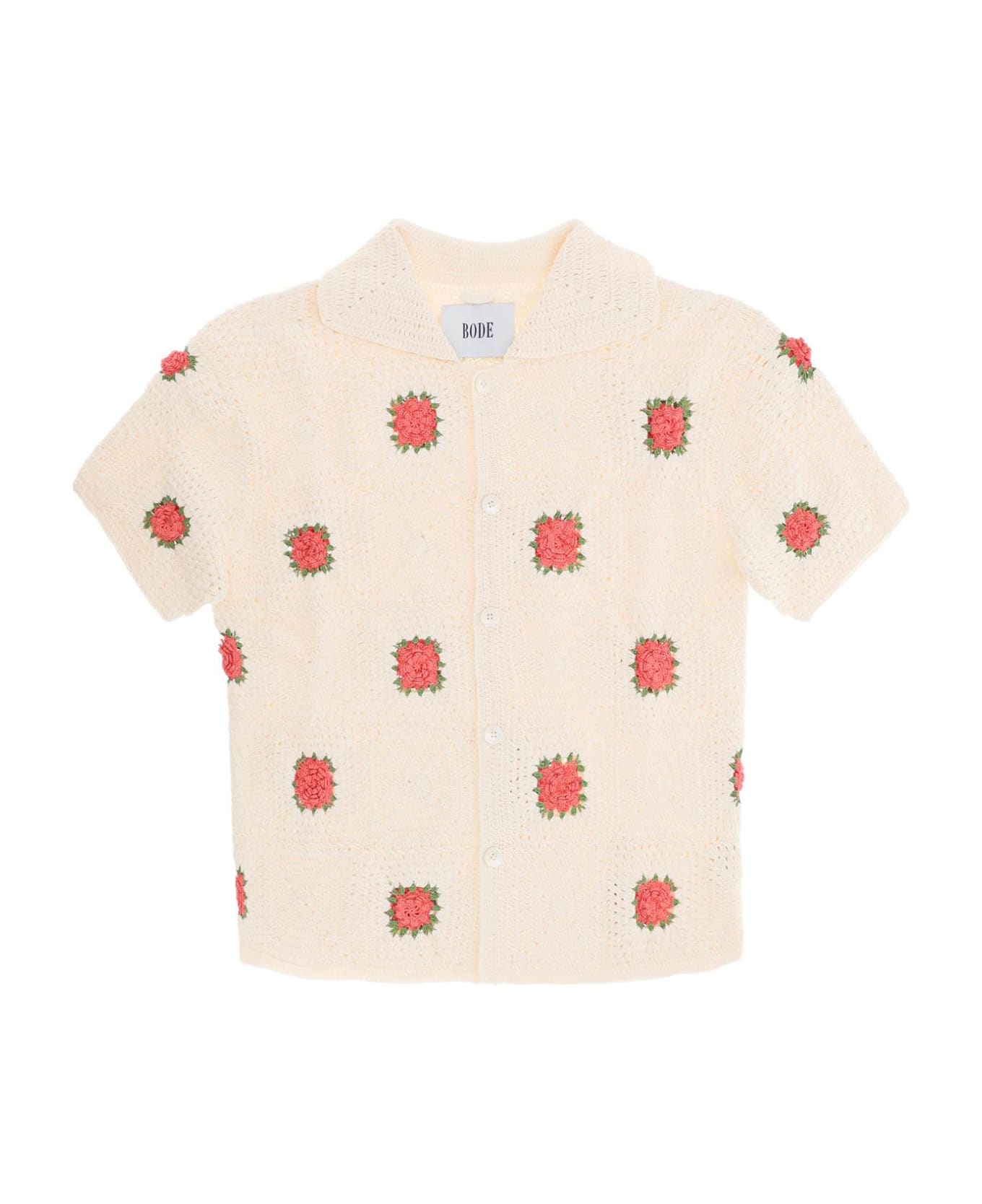 Bode boxy-fit shirt designed with short sleeves, spread collar and button-up closure. It is made from crochet cotton enriched by a contrast floral motif throughout, inspired to vintage kitchen textiles. The model is 187 cm tall and wears a size M/L.