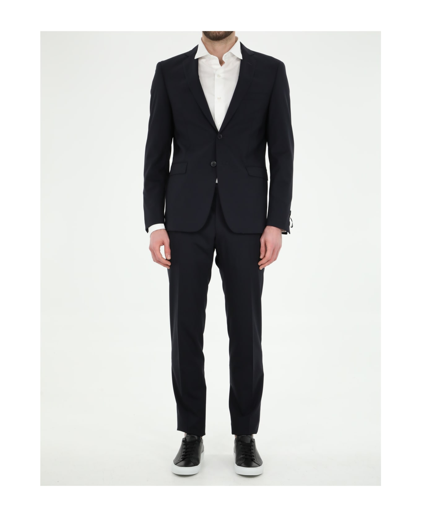 Two-pieces blue stretch wool suit. Jacket with single-breasted closure with front buttons, peaked lapel, two front flap pockets, one welt pocket on chest and buttoned cuffs. Trousers feature straight leg, two side welt pockets and one rear welt pocket with button.