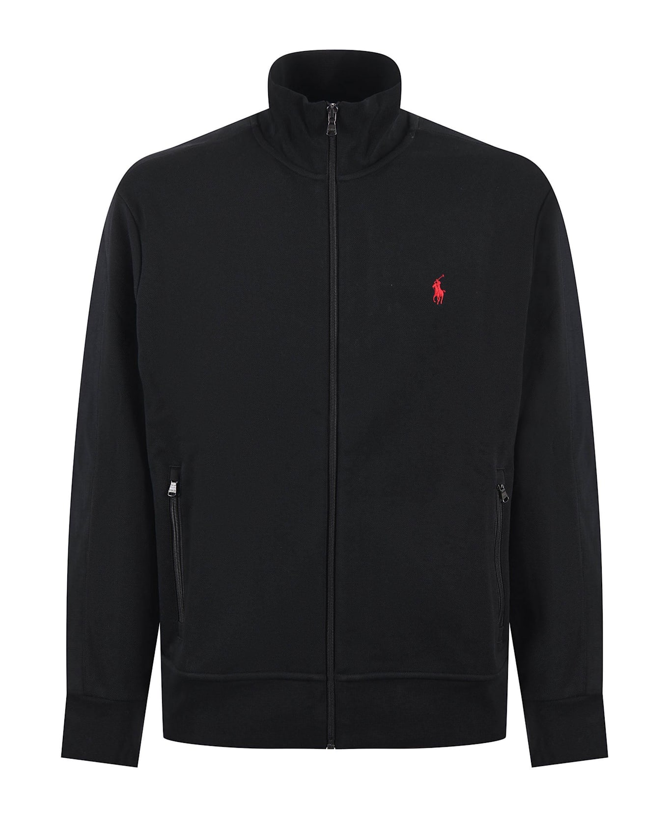 Polo Ralph Lauren cotton pique sweatshirt Black. High knit collar. Zip pockets. Red embroidered front logo. Ribbed cuffs and bottom. Zip closure. Size in photo M 54% cotton, 46% polyester