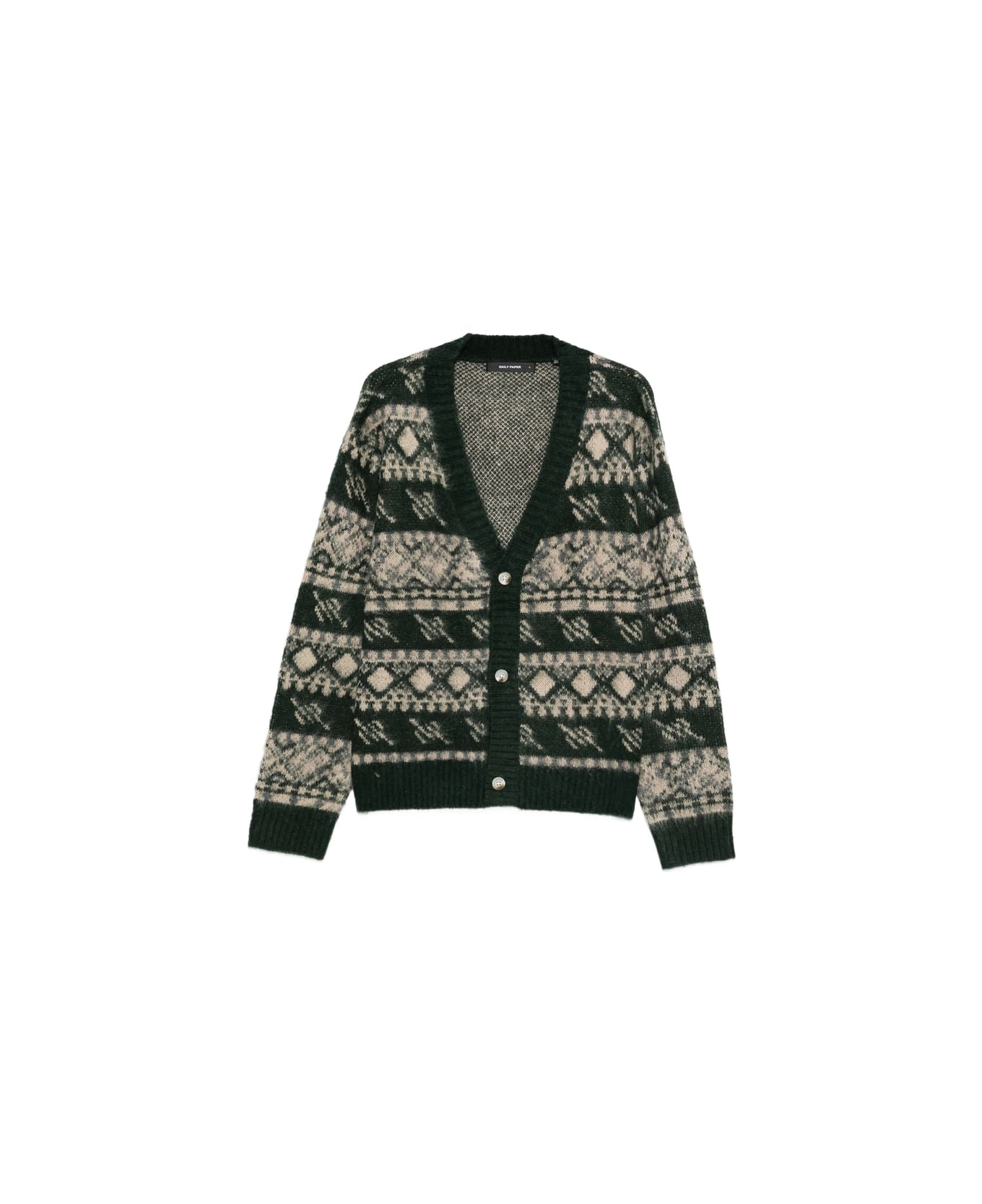 green patterned intarsia knit V-neck front button fastening long sleeves ribbed hem