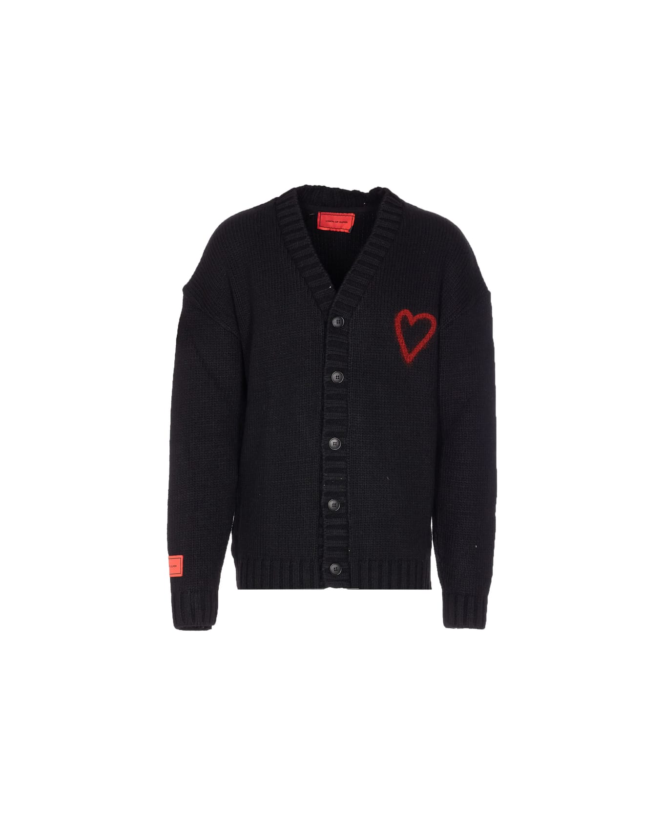 black embroidered heart button closure V-neck ribbed trims