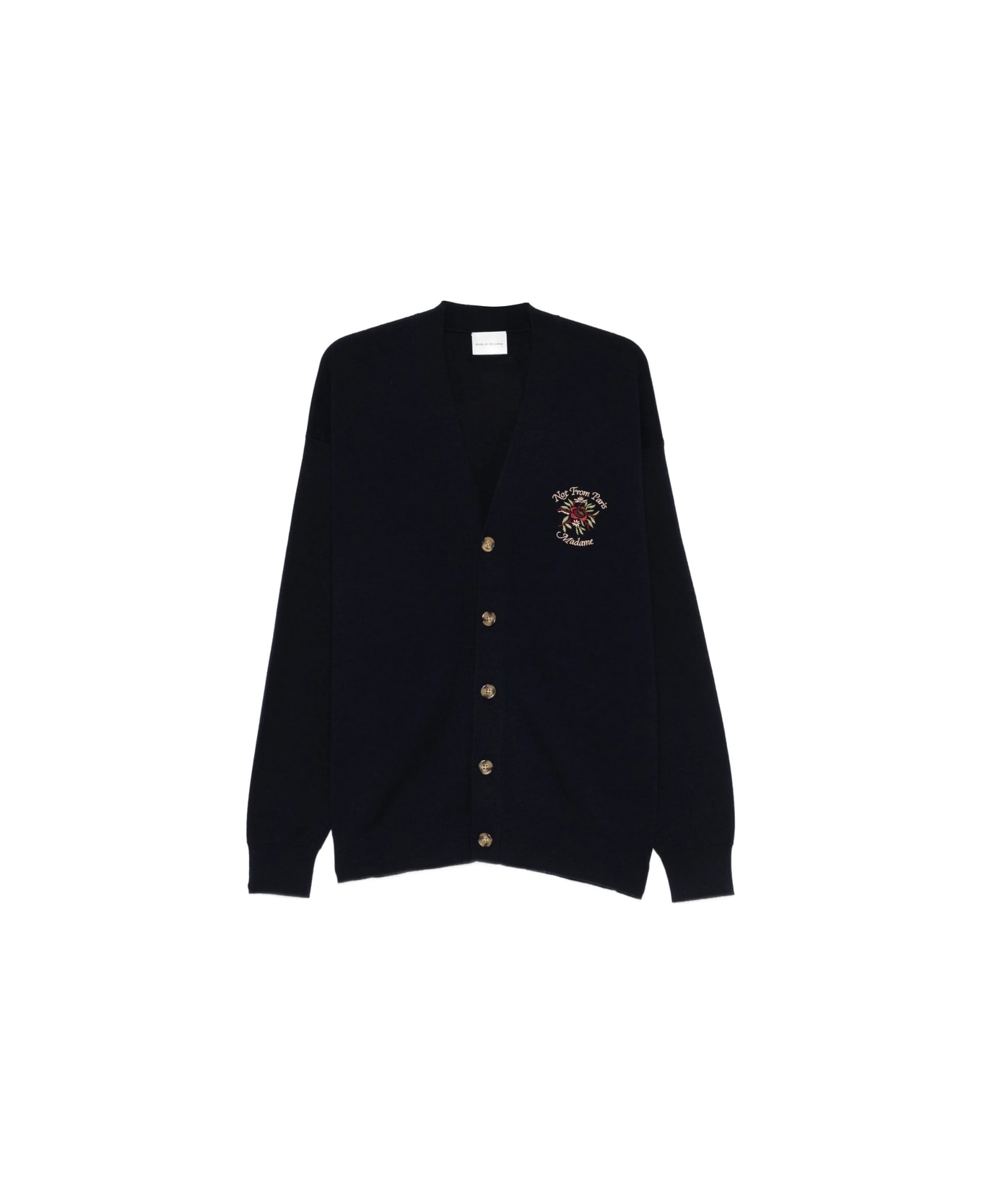navy blue embroidery button fastening V-neck long sleeves ribbed knit trim