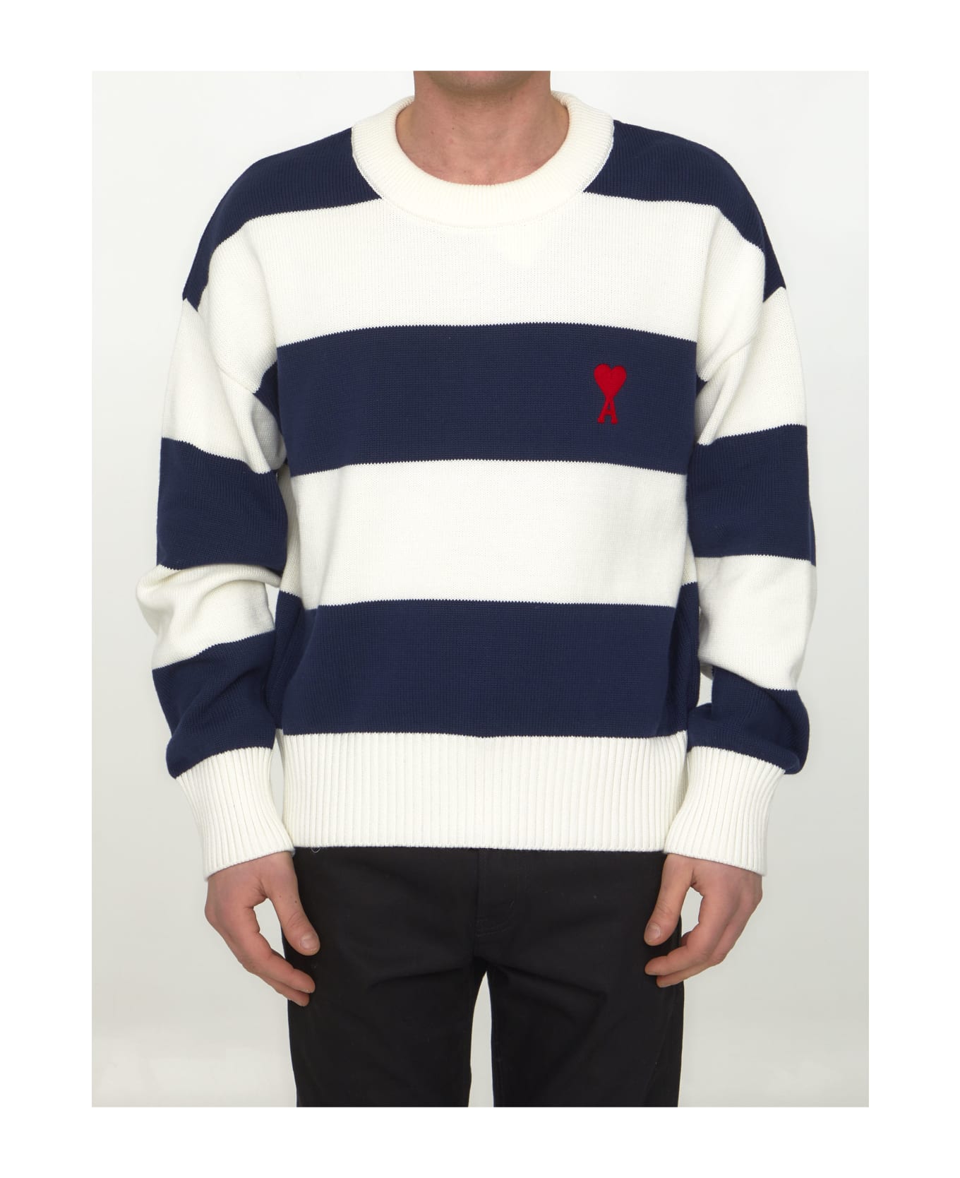 White and blue striped organic cotton and merino wool sweater with red Ami De Coeur motif embroidered on chest. Ribbed neck, cuffs and hem. The model is 188cm tall and wears size XL.