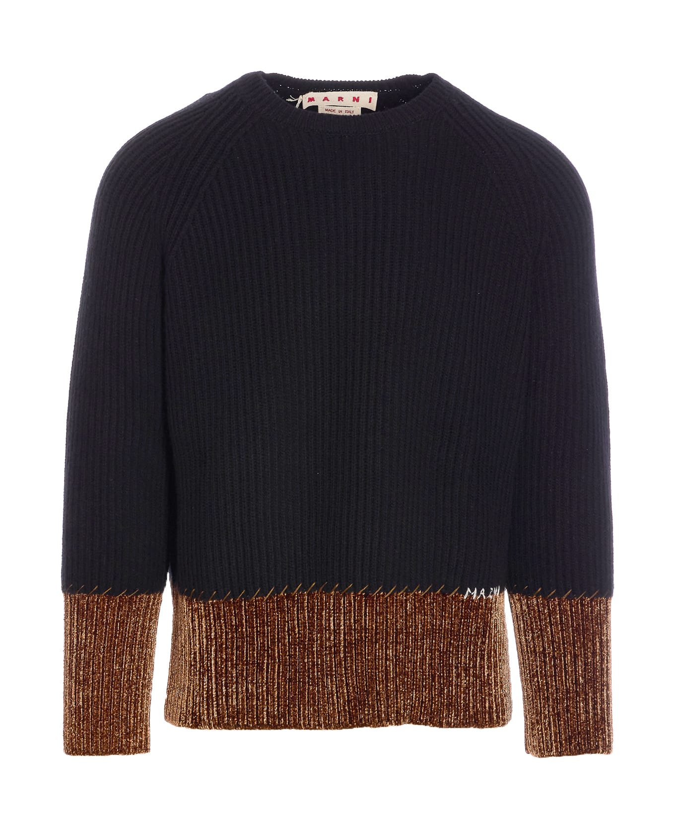 Marni black sweater, crewneck, long sleeves, embroidered logo at bottom Composition: 100% Virgin Wool