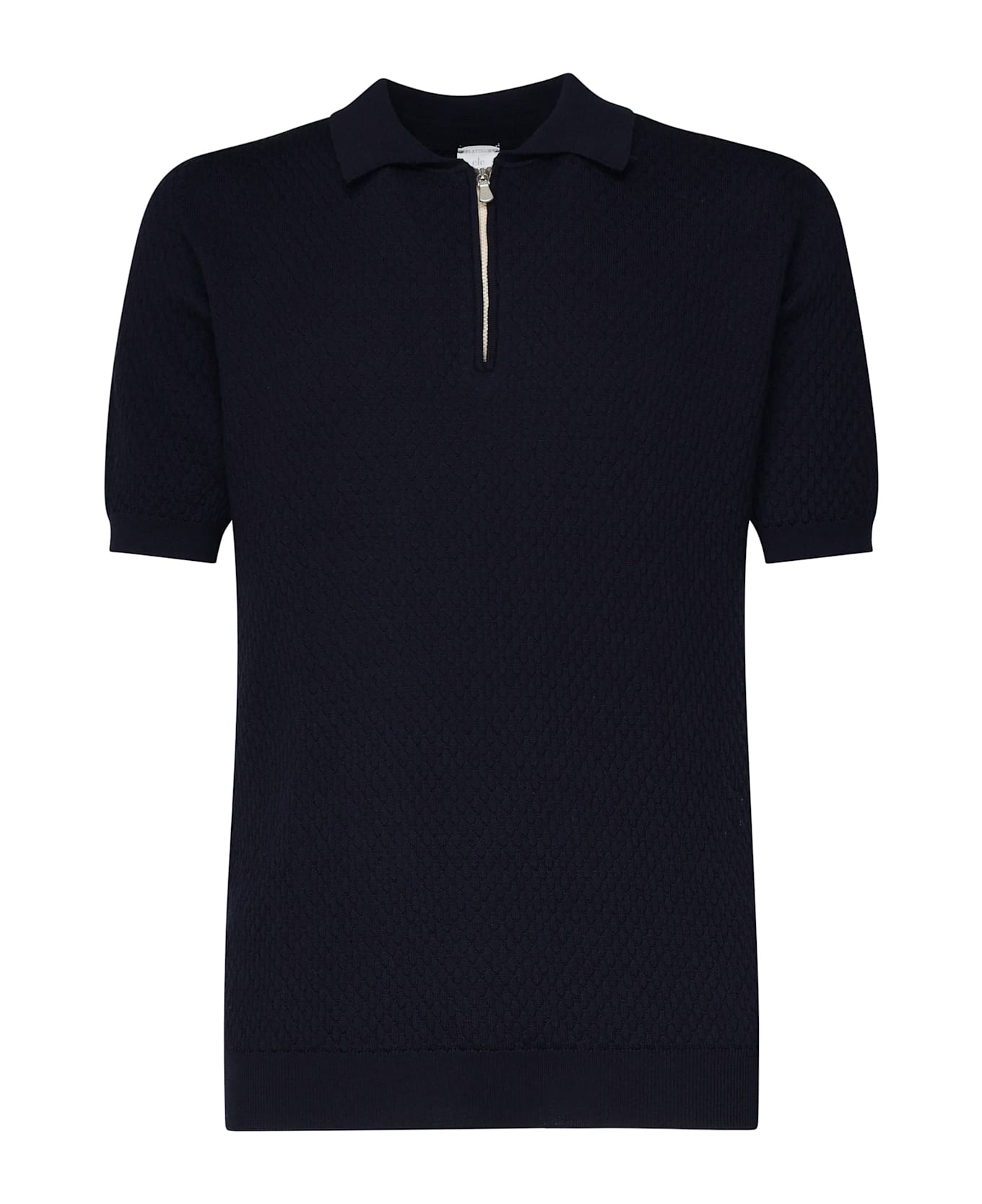 -Polo shirt with zip closure -Short sleeves -Straight hem -Size shown in photo is M -Made in Italy -Colour: Blue Composition: 70% Merino Wool, 30% Silk