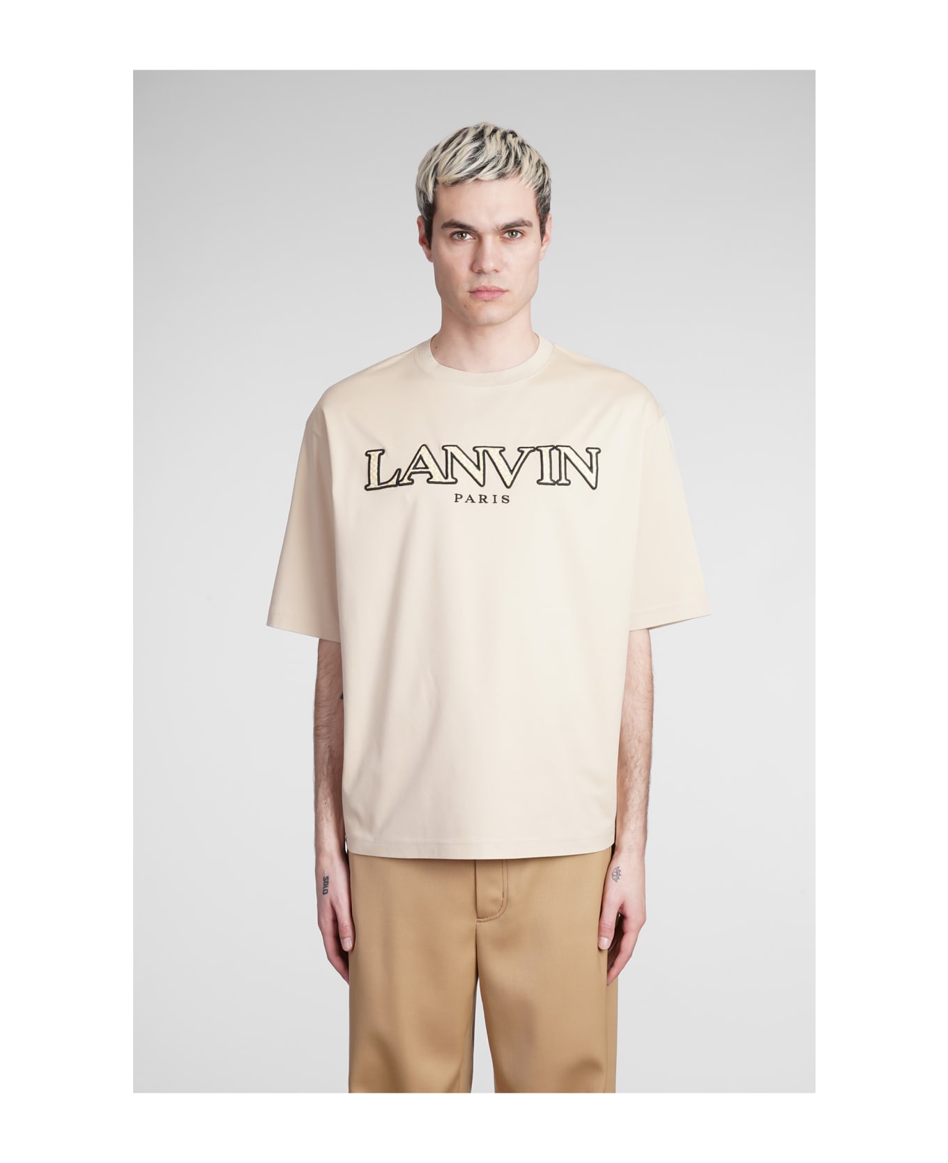 T-Shirt in beige cotton, round neck, short sleeves, box fit, Made in Italy, front logo, 100% cotton, Model is 1. 83 and wears size M