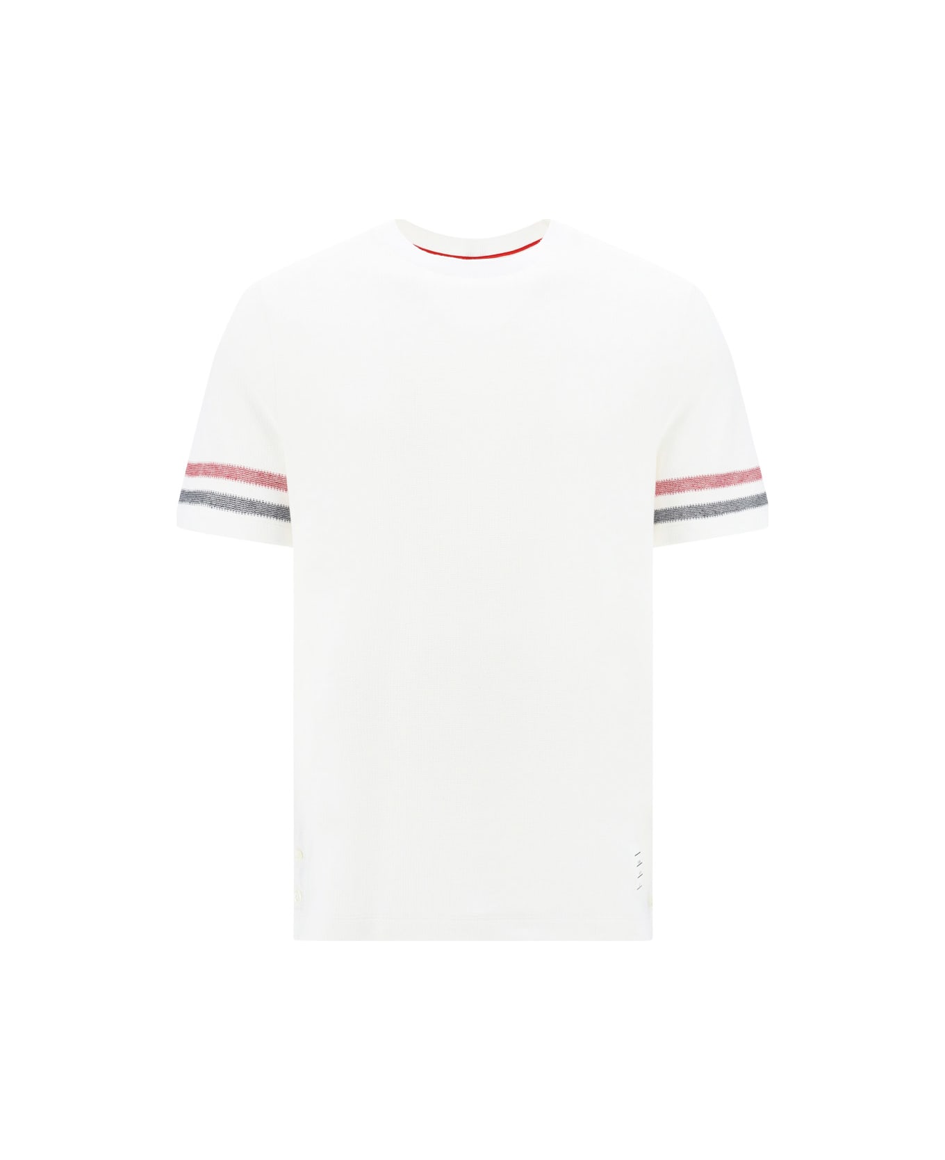 Cotton t-shirt by thom browne, iconic tricolour bands on sleeves, slight side slits with buttons for closure, patch with iconic brand logo applied on the front, flared hem, regular fit. Composition: 100% % Cotton
