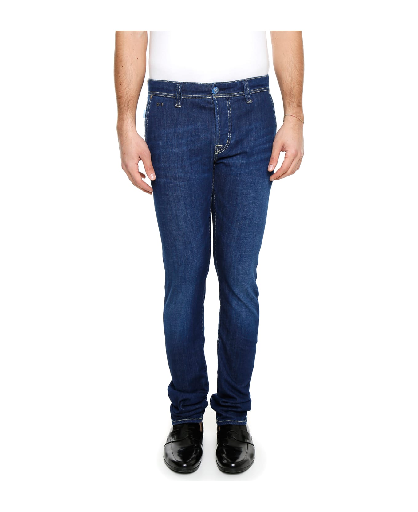 Tramarossa washed stretch denim jeans with five pockets and concealed button closure. Contrast stitching details, logo label on the back. Model is wearing a size 31.