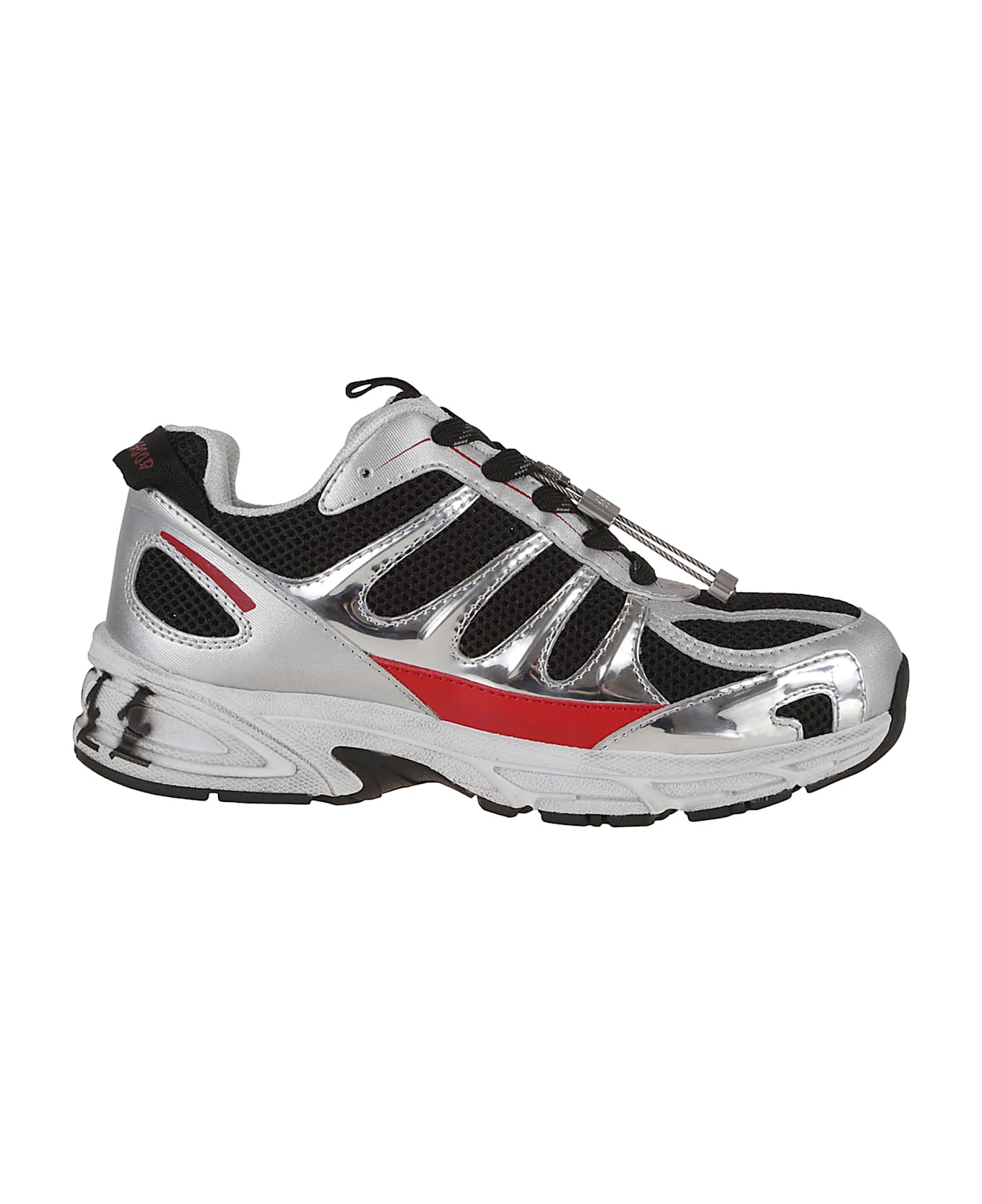DRAGGER sneakers in metallic yarn by 44 LABEL GROUP. Top closure with laces. Characterized by dirty effect treatment, contrasting logo on the sole and on the strap and metal plate.
