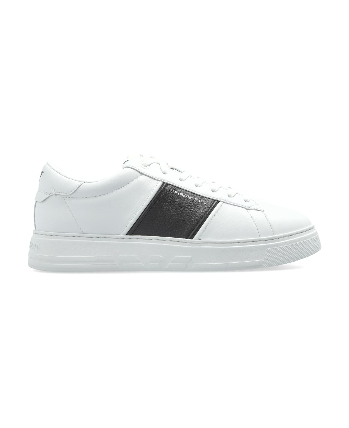 Discover refined athletic sophistication with these low-top sneakers from Emporio Armani. Impeccably crafted from supple white leather, the sleek silhouette showcases a rounded toe and minimalist profile, accented by a bold black side panel. Delicate, contrasting EMPORIO ARMANI logos are subtly placed across the side, tongue, and inner lining while an embossed signature eagle graces the heel tab for a touch of distinction. The interior features a luxuriously smooth lining, ensuring unmatched comfort, while the durable rubber sole delivers superior traction and lasting support. These sneakers embody modern elegance, merging clean lines with iconic branding to elevate any ensemble. Why choose this product? Exquisite craftsmanship and premium leather materials Elegant minimalist aesthetic, versatile for any occasion Signature Emporio Armani iconography for elevated style Exceptional comfort with a smooth, meticulously finished interior Durable, high-traction rubber sole for all-day practicality