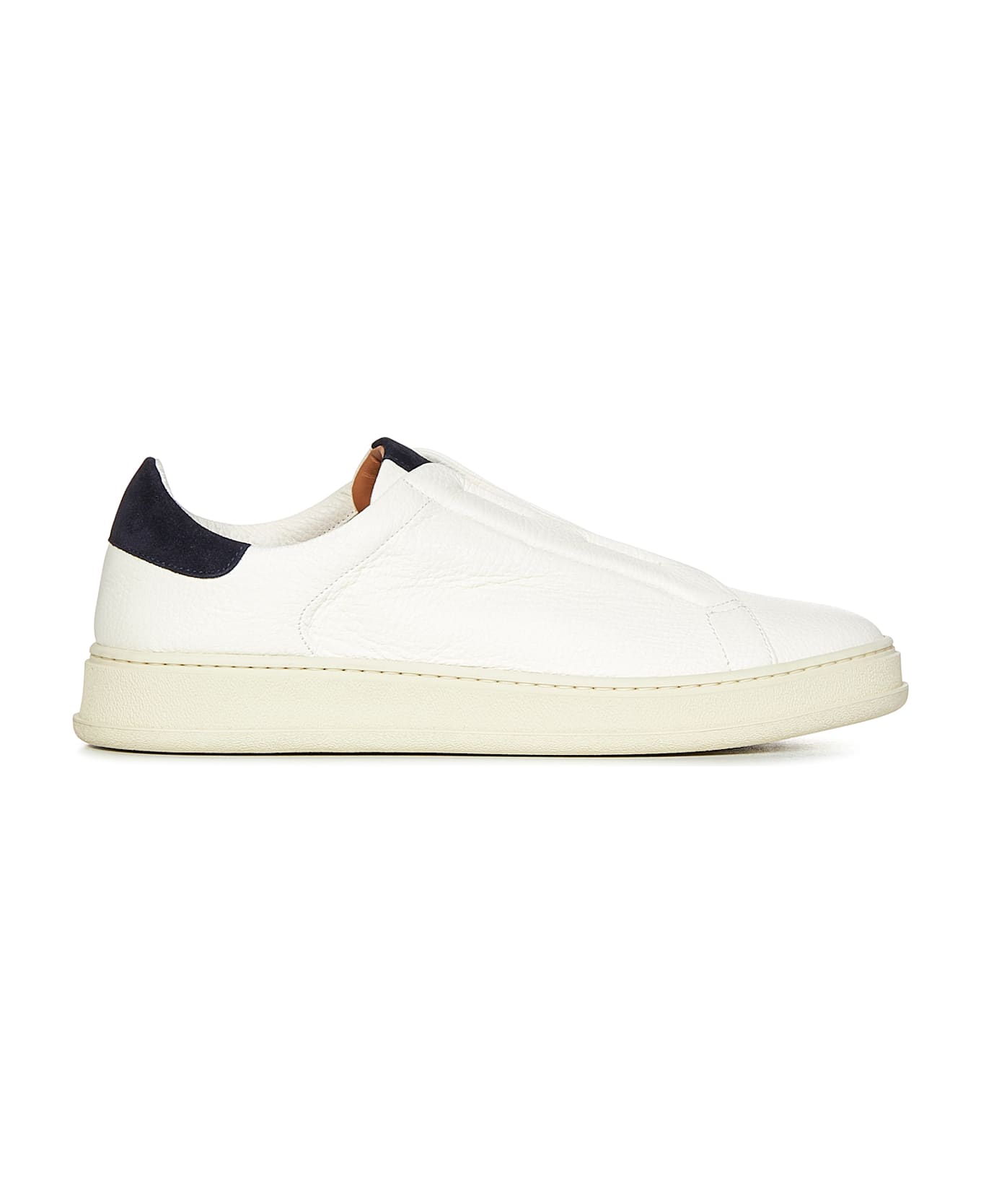 White leather slip-on sneakers with navy blue suede inserts and rubber sole. 100% Pelle Di Cervo Composition: White Leather Slip-on Sneakers With Navy Blue Suede Inserts And Rubber Sole.