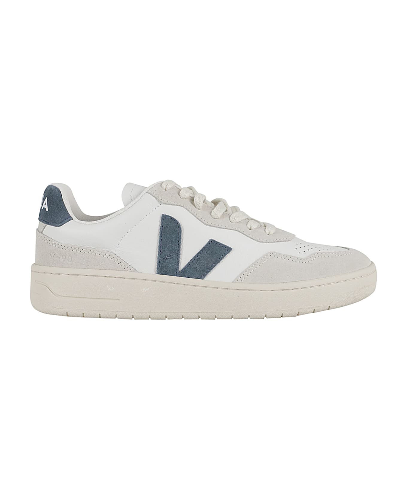 V 90 sneakers - Veja - White color - Smooth leather and suede upper - Round toe with perforated design - Blue embossed side logo - Contrasting blue logo heel - Cotton lace-up closure - Rubber sole
