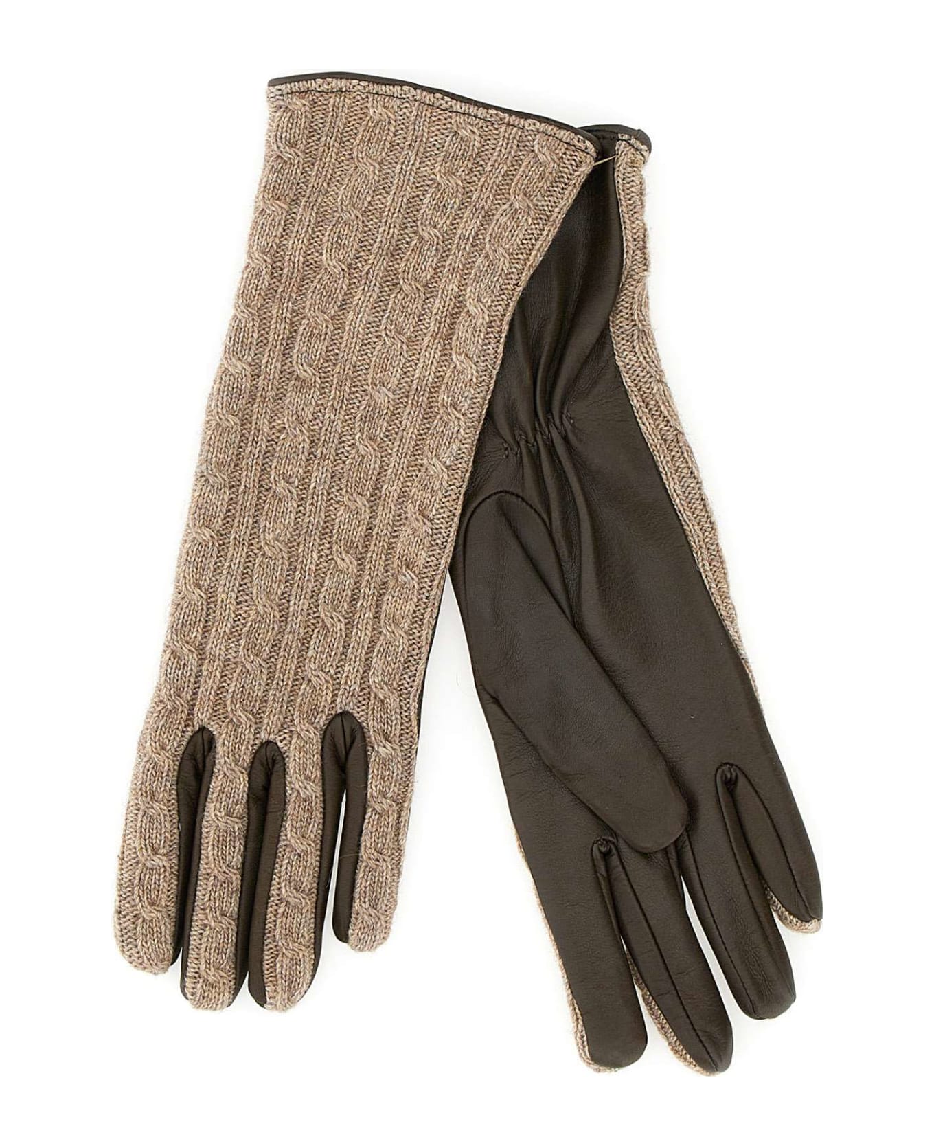 Eleventy women gloves, hazelnut and chestnut colors, lower part in lambskin and upper part in wool blend with braids. Made in Italy. Composition: Lamb Leather; Lining: 100% Seta; Rib: 40% Wool, 25% Polyamide, 25% Viscose, 10% Cashmere;