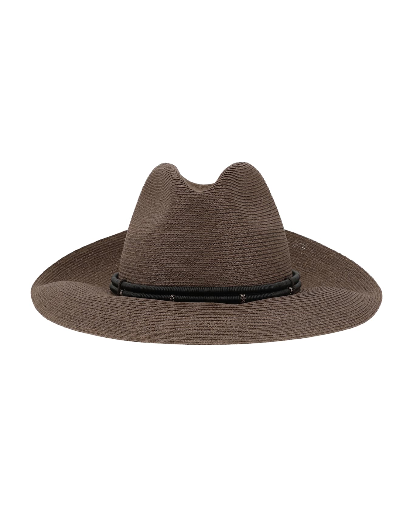 Fedora made of hemp and techno cotton by brunello cucinelli, with a leather band and iconic shiny beads that add a touch of elegance and light to the design. a hat with a sophisticated and modern style, perfect for completing a classy look with refined details and high-quality materials.