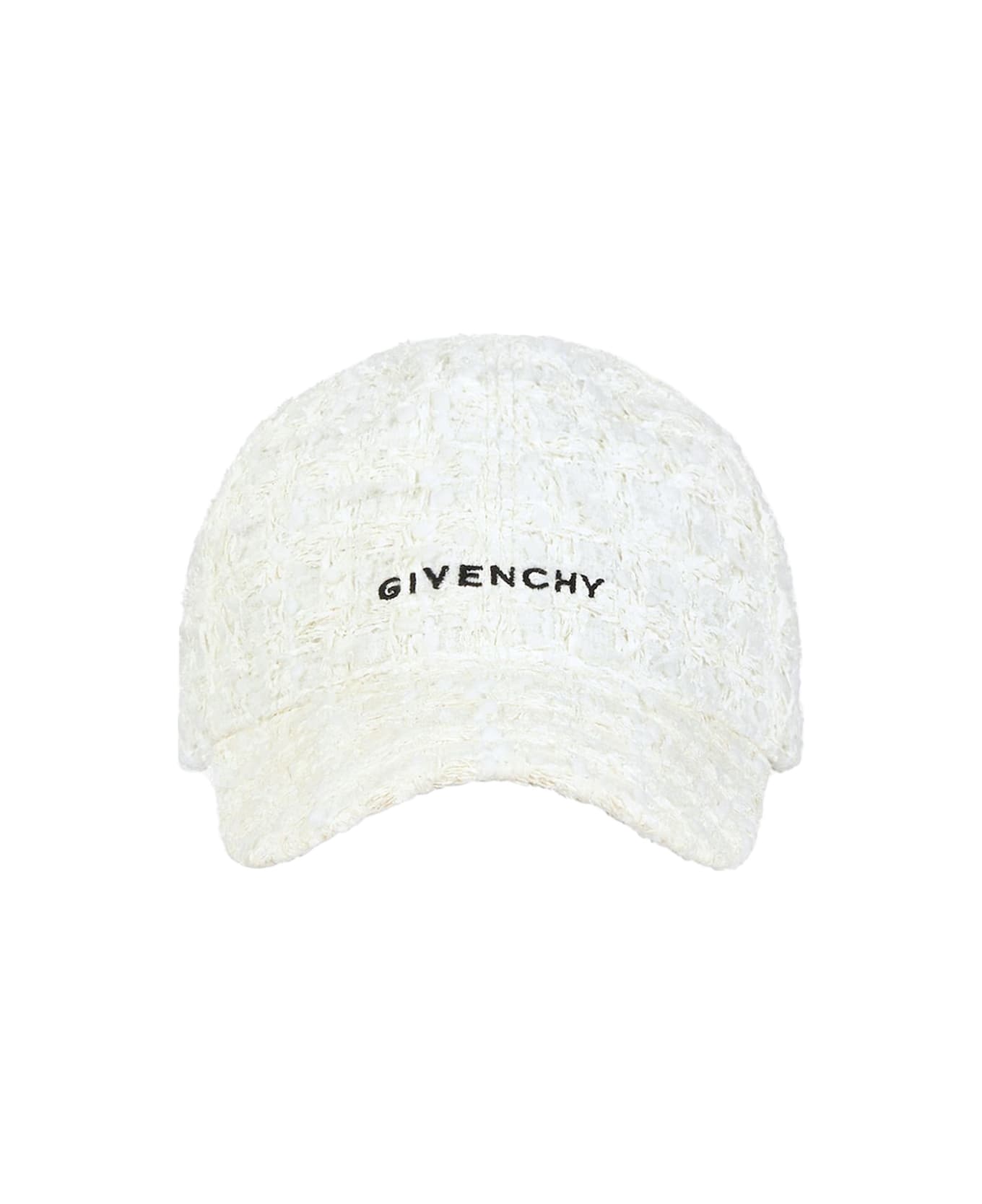 GIVENCHY baseball cap made of white tweed with curved visor, GIVENCHY signature embroidered on the front and back strap with GIVENCHY engraved metal buckle.