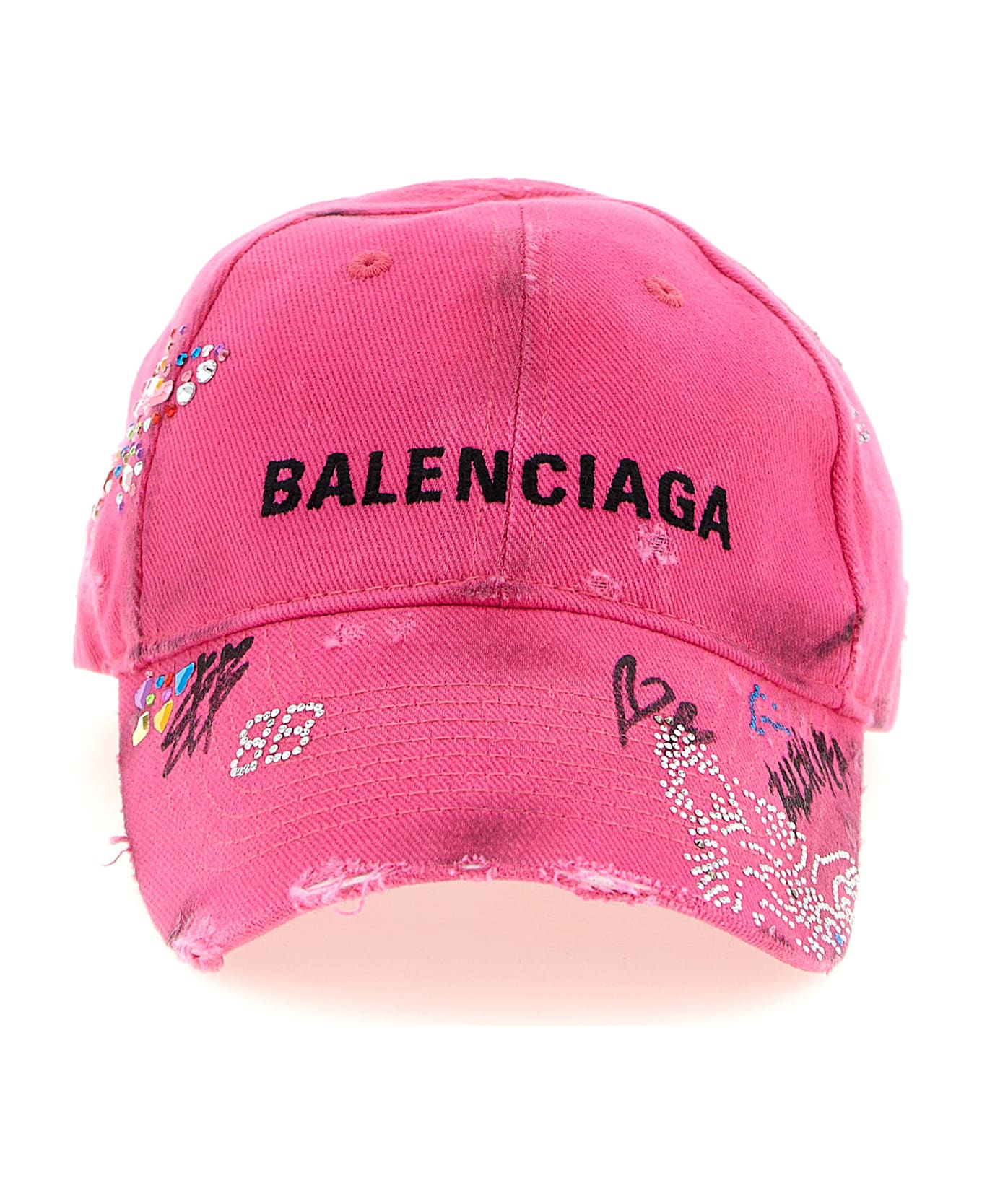 Worn-out and dirt-effect cotton drill Upcycled beanie with rhinestone and pen scribbles, front logo embroidery, baseball model, strap with adjustable velcro closure at the back. The upcycling process makes each creation unique. Composition: 100% cotton