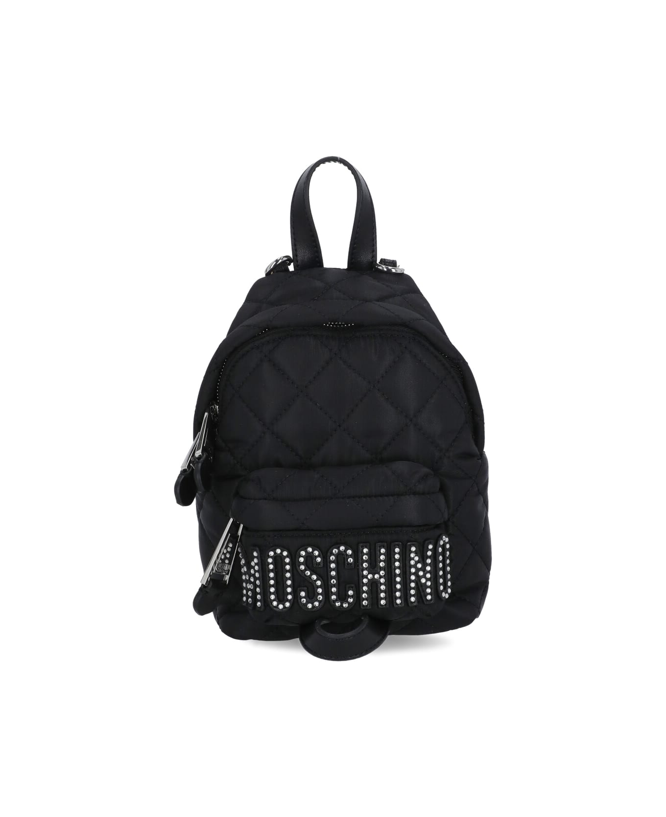 - Black Moschino quilted backpack for woman - One handle - Two adjustable and removable shoulder straps - Front zip fastening - Front contrasting colour rhinestone logo - One front zip pocket - One main compartment - One internal welt pocket Composition: 100% Nylon