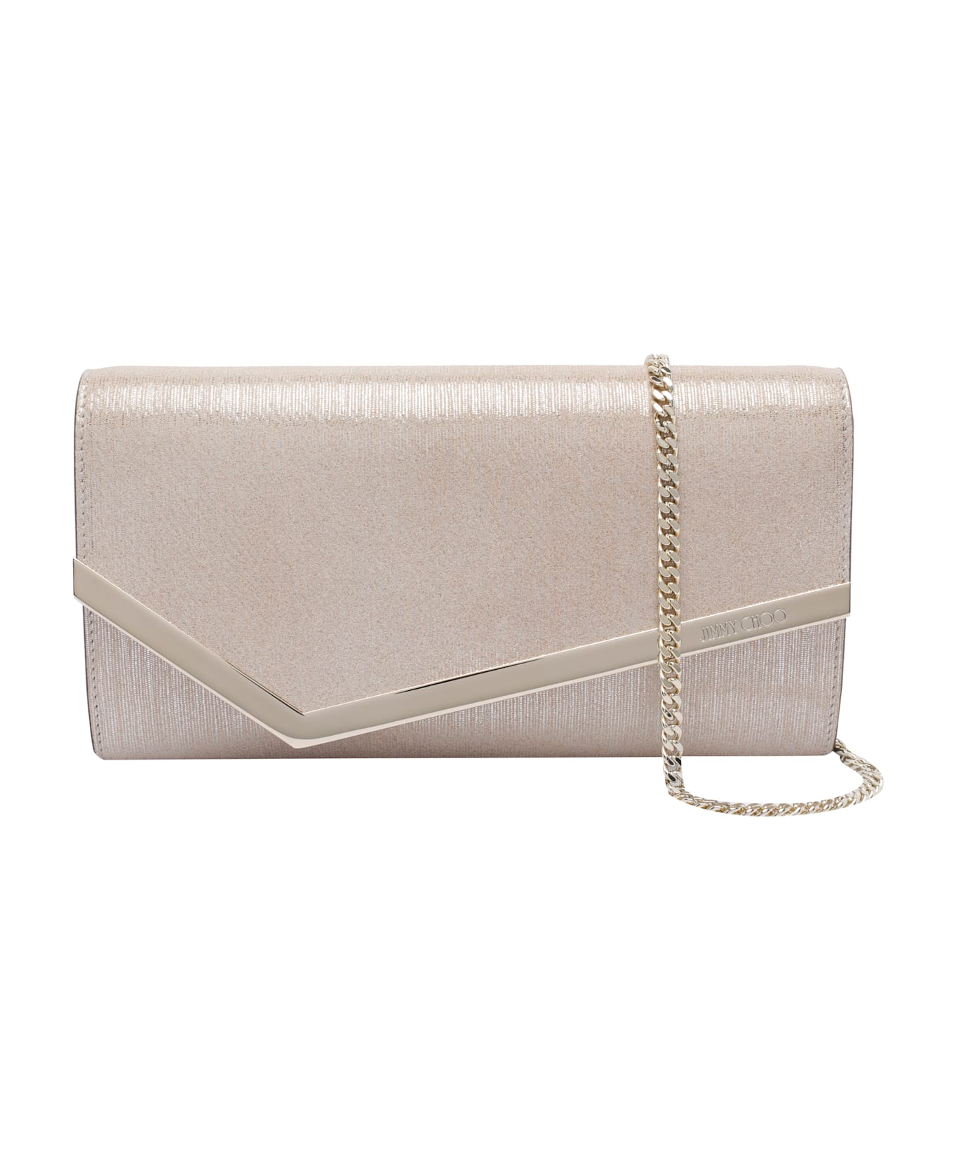 Jimmy Choo gold Emmie pochette, magnetic closure, 6 inner slots, 1 zipped and 1 open pocket, removable chain strap Composition: 100% Calf Leather