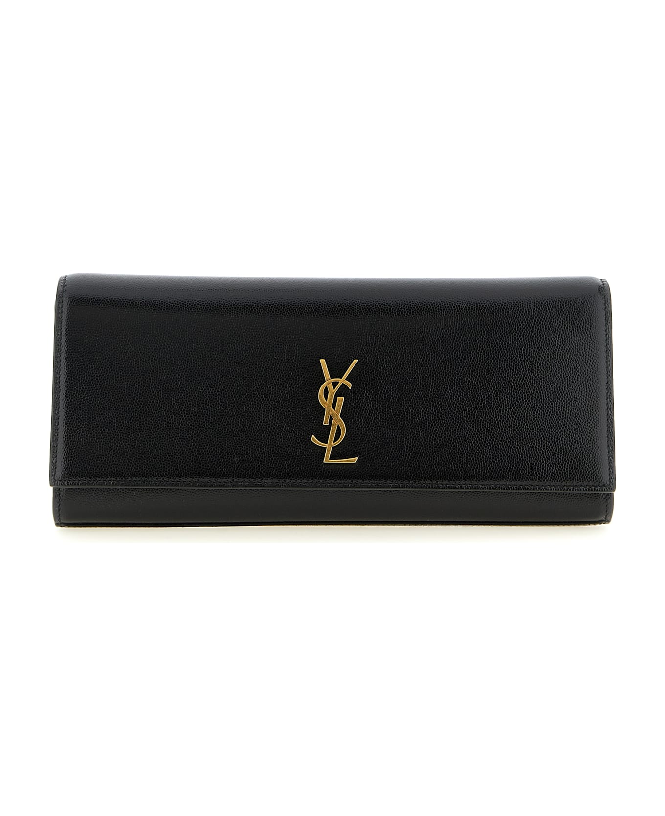'Kate' grain de poudre leather clutch, magnetic flap closure with antiqued metal 'Cassandre' detail on the front, removable chain shoulder strap. Composition: 100% calfskin leather (Bos Taurus)