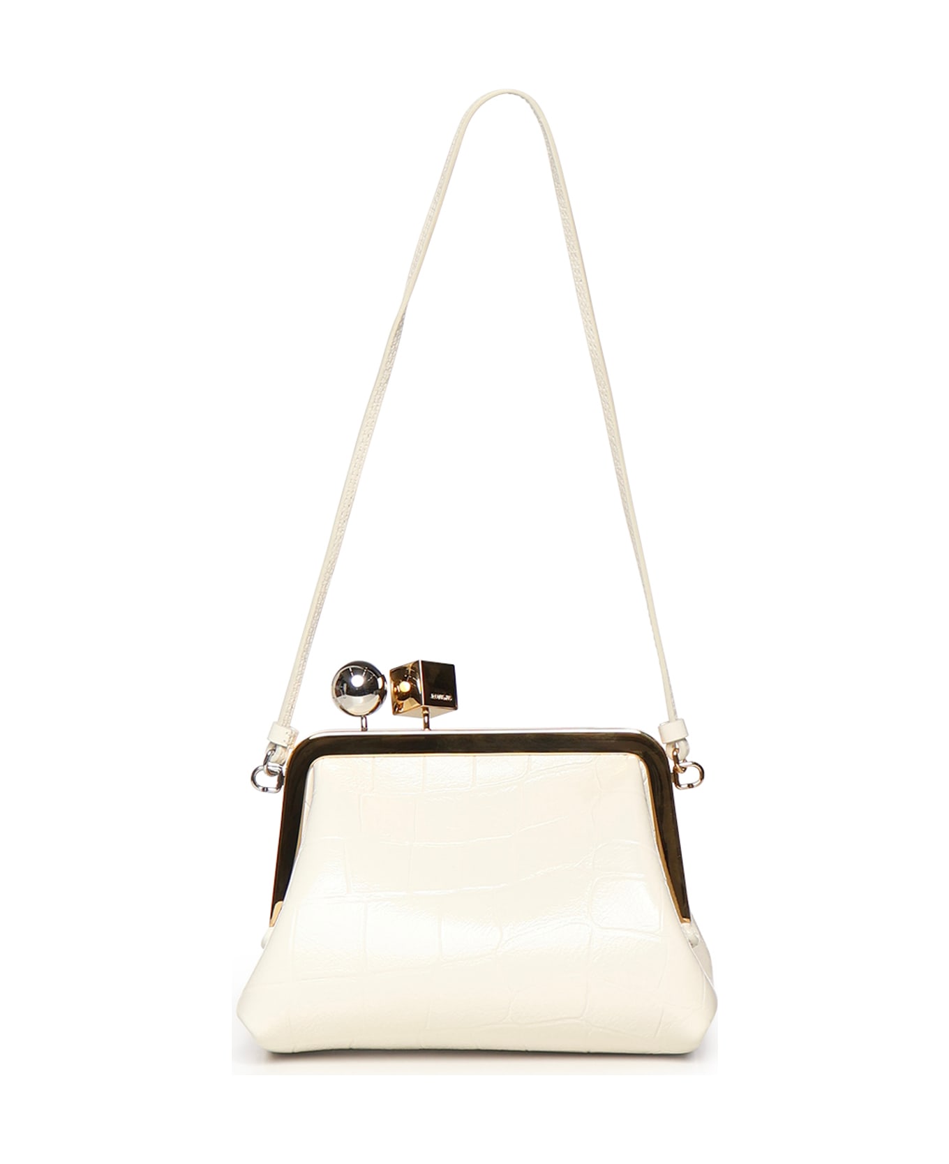 - Made of crocodile-embossed leather - Metal round-carré closure - Interior pocket - Removable shoulder strap - Dimensions: 20 x 13. 5 x 13 cm - Made in Italy - Designer color: Light Ivory