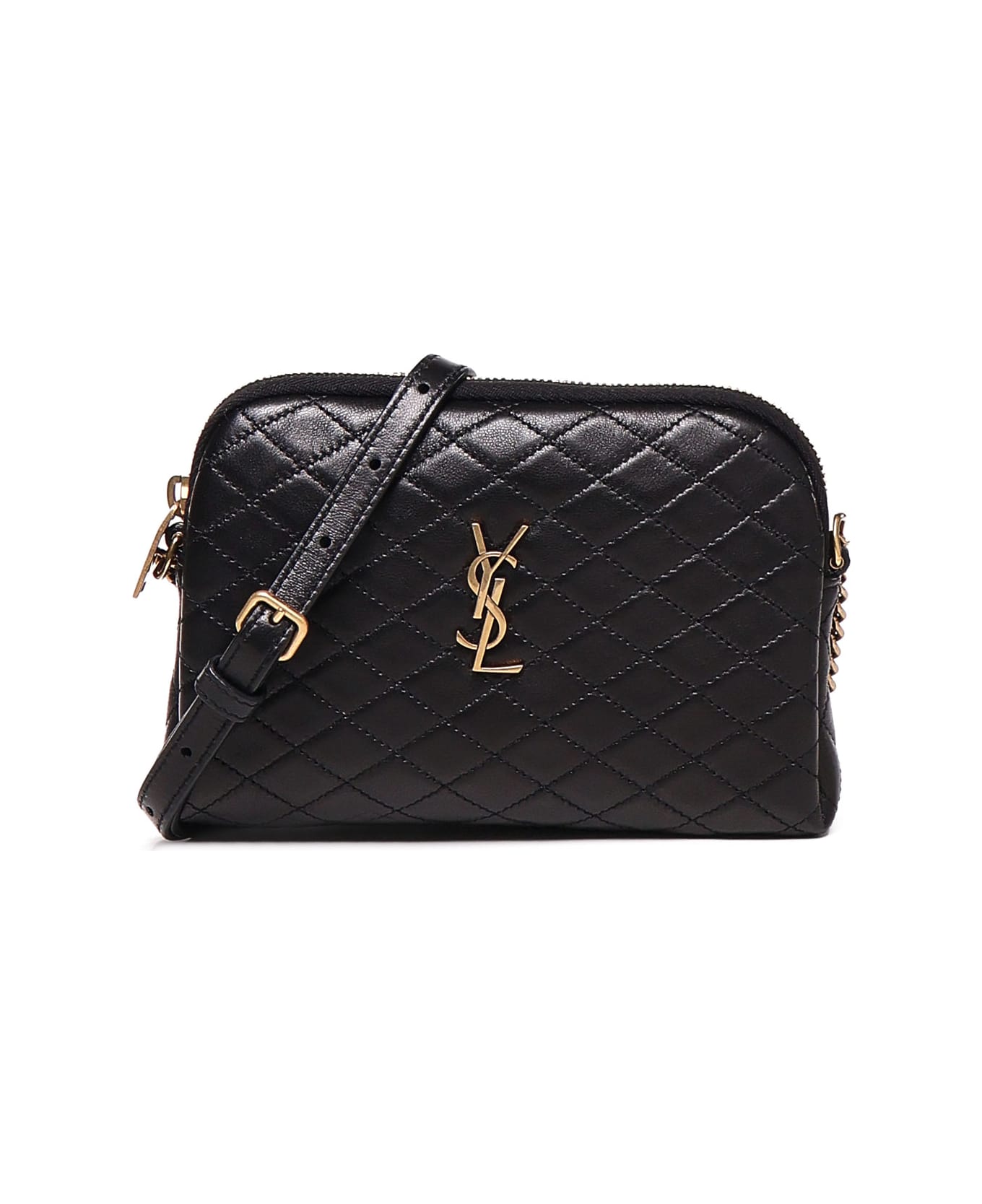 -Leather shoulder strap with adjustable chain -Leather lining -Quilted check stitching -Zip closure -Dimensions: 19 x 12 x 3 cm -Made in Italy -Color: Black